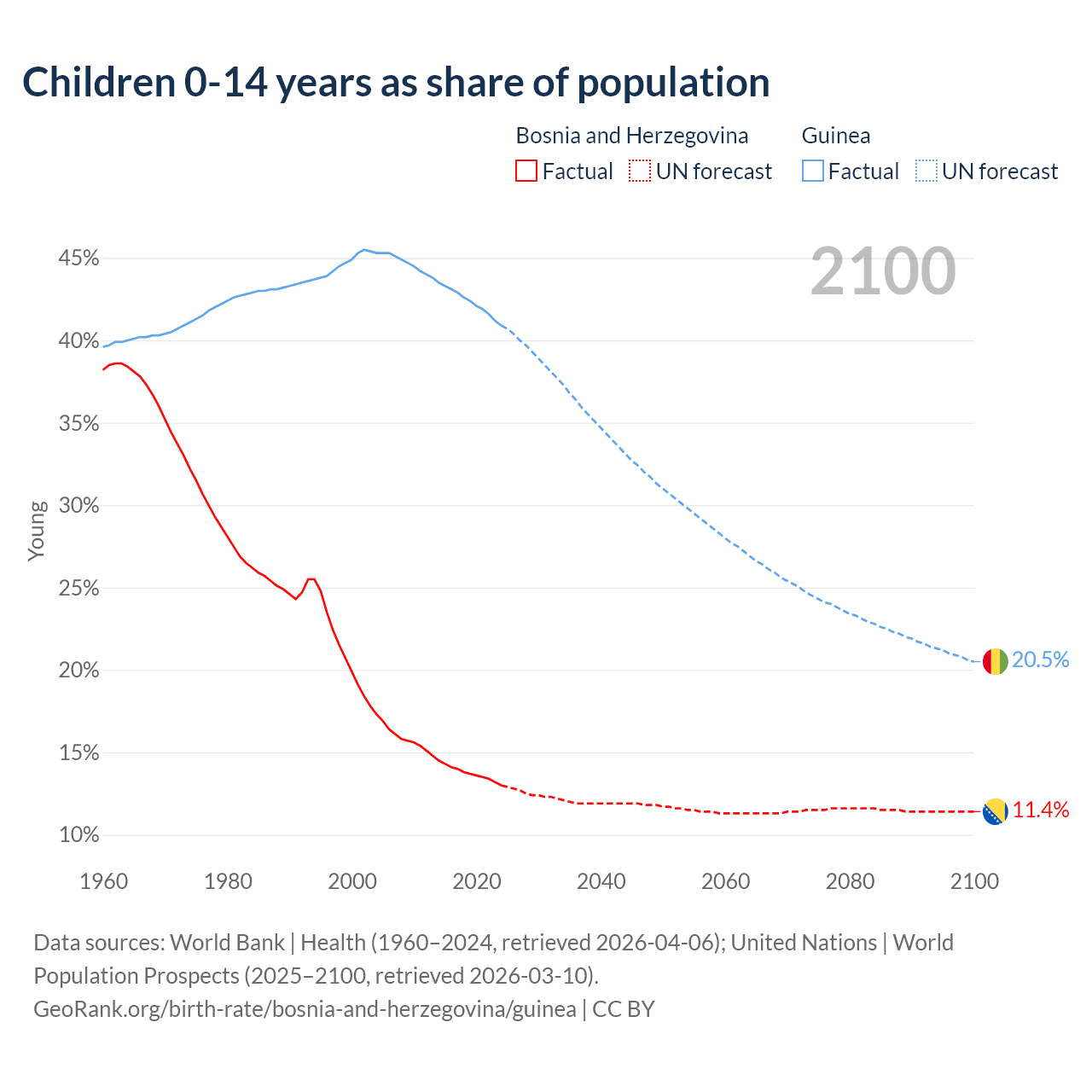 Bosnia and Herzegovina has an annual birth rate of 7.71 births per 1,000 people, compared to 33.8 for Guinea. The average number of children a woman is expected to have during her lifetime — the fertility rate, is 1.49 in Bosnia and Herzegovina and 4.22 in Guinea — 183.8% difference.