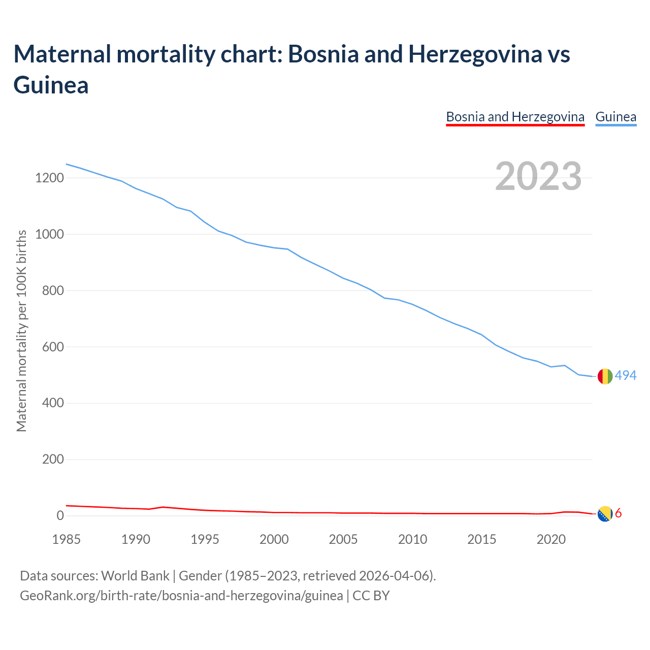 The maternal mortality rate, which is the probability of dying during childbirth or within 42 days of pregnancy termination, is 6 deaths per 100,000 live births in Bosnia and Herzegovina, compared to 494 deaths in Guinea.