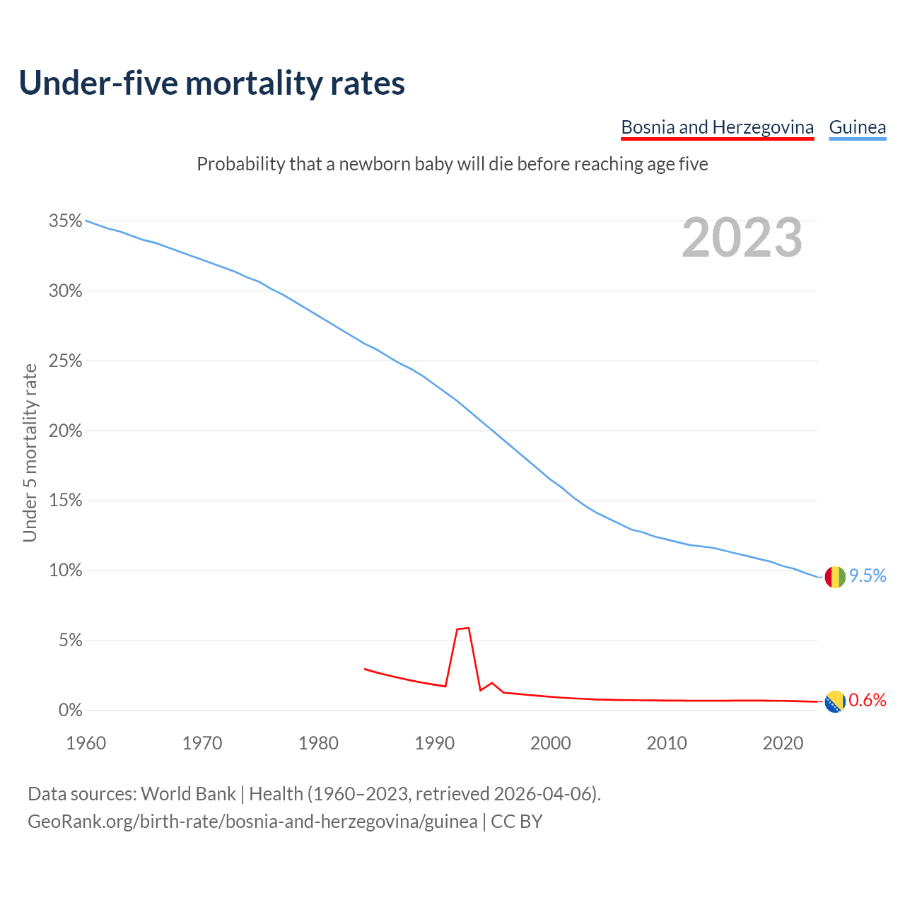 The chance that a newborn baby will die before reaching age five is 0.6% in Bosnia and Herzegovina and 9.5% in Guinea. Above is a chart with historical data on under-five mortality rates.