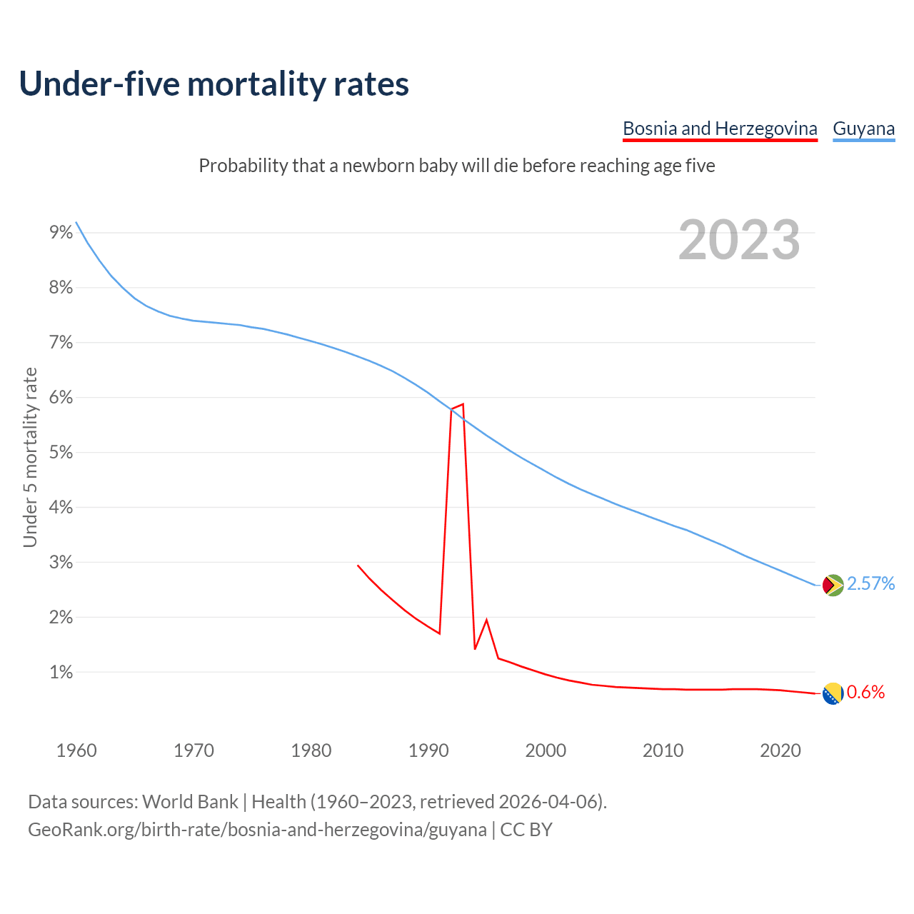 The chance that a newborn baby will die before reaching age five is 0.6% in Bosnia and Herzegovina and 2.57% in Guyana. Above is a chart with historical data on under-five mortality rates.