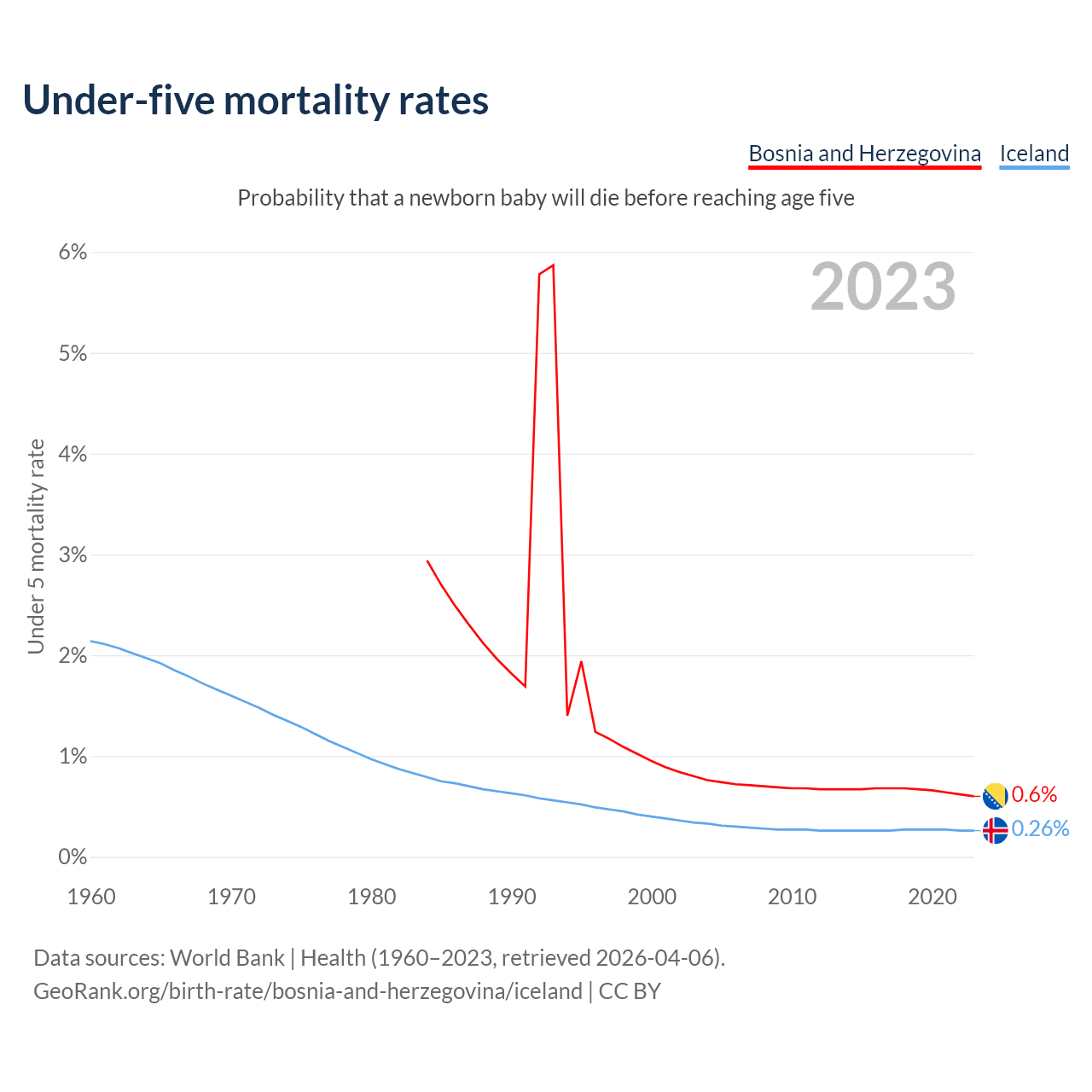 The chance that a newborn baby will die before reaching age five is 0.6% in Bosnia and Herzegovina and 0.26% in Iceland. Above is a chart with historical data on under-five mortality rates.