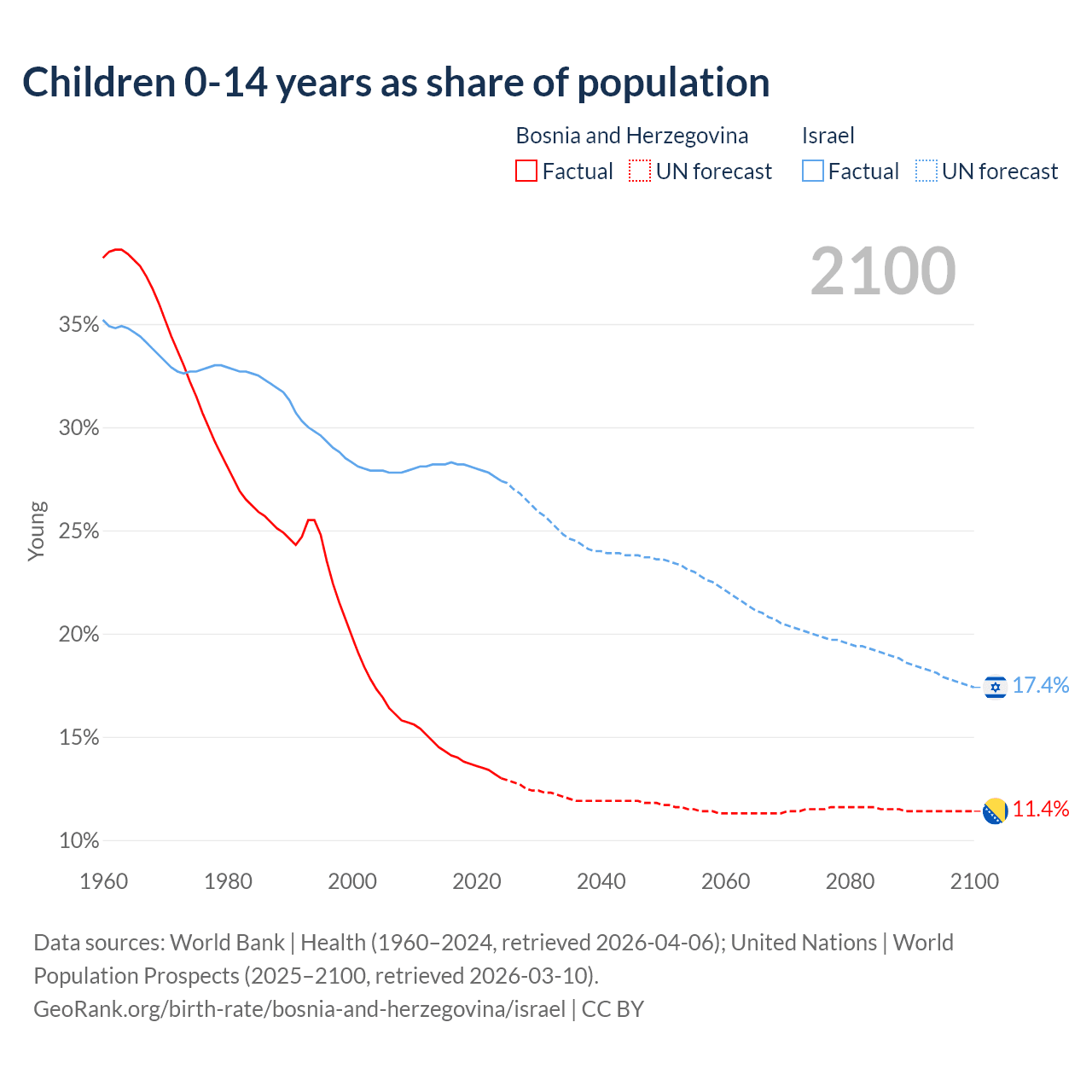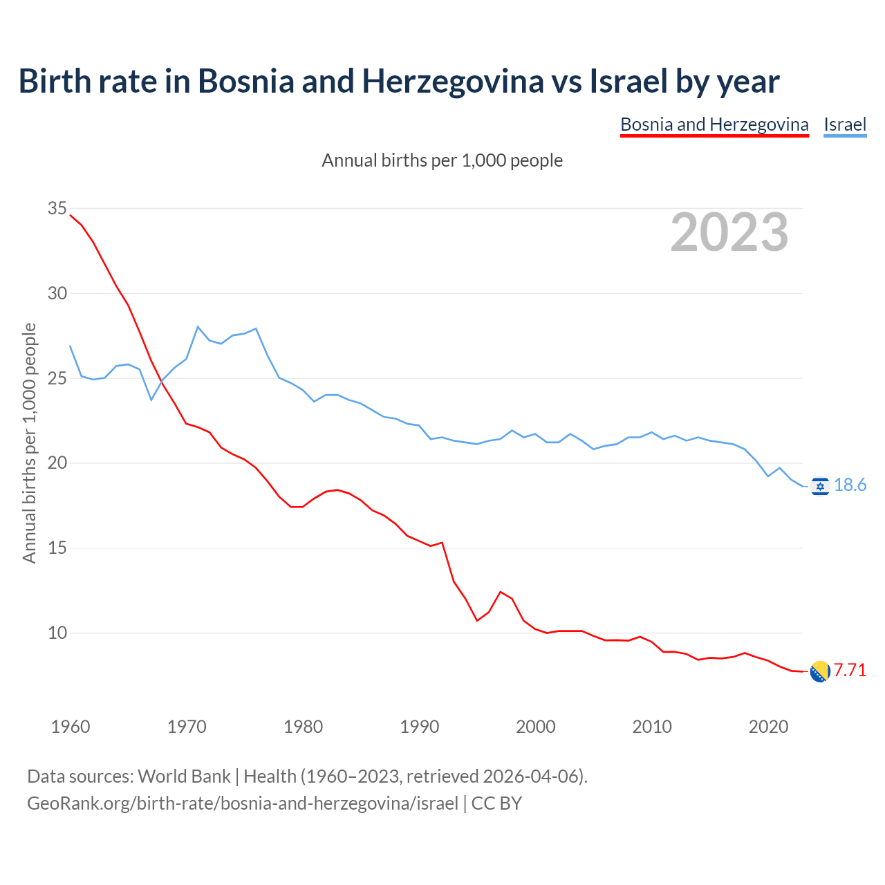 Bosnia and Herzegovina has an annual birth rate of 7.71 births per 1,000 people, compared to 18.6 for Israel. The average number of children a woman is expected to have during her lifetime — the fertility rate, is 1.49 in Bosnia and Herzegovina and 2.85 in Israel — 91.8% difference.
