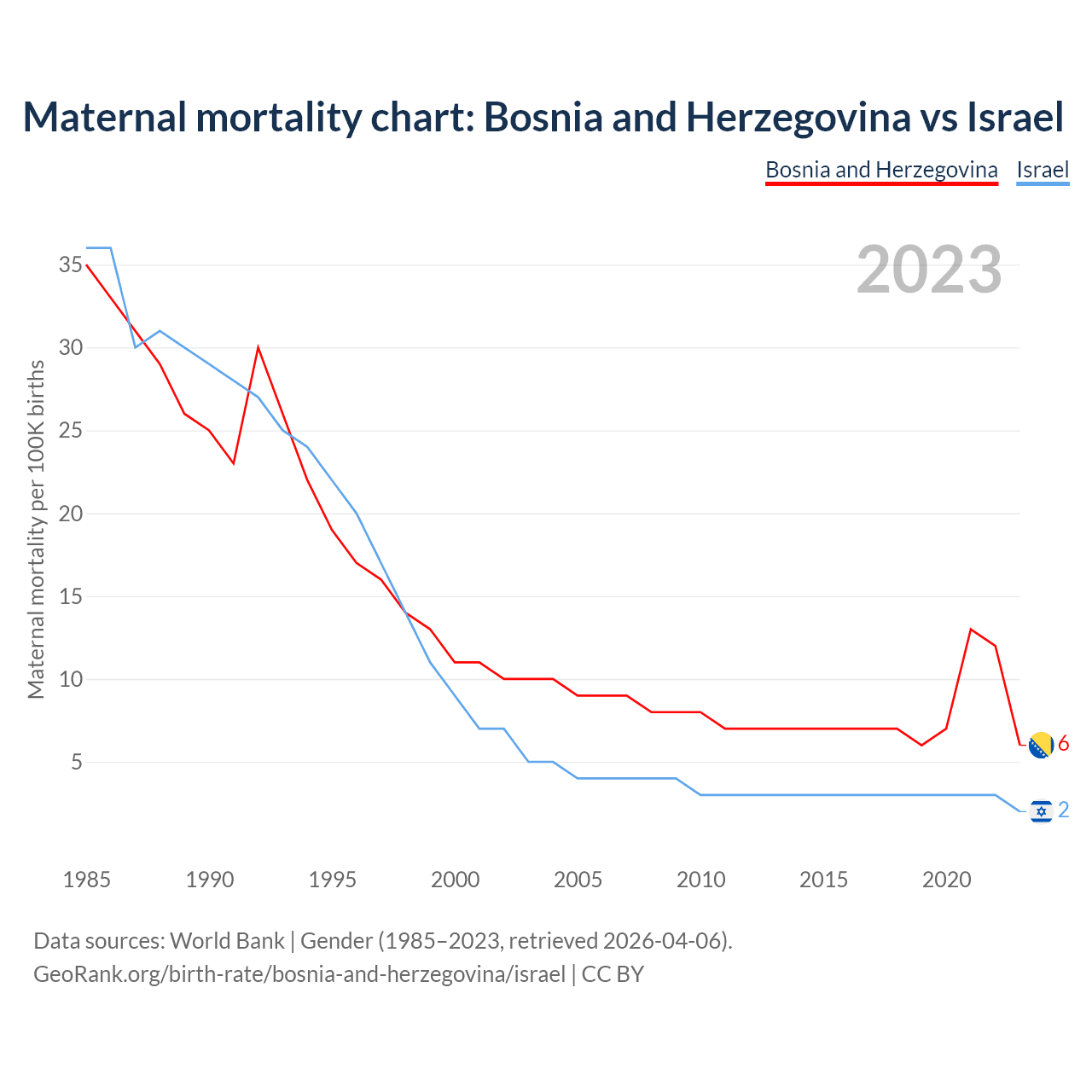 The maternal mortality rate, which is the probability of dying during childbirth or within 42 days of pregnancy termination, is 6 deaths per 100,000 live births in Bosnia and Herzegovina, compared to 2 deaths in Israel.