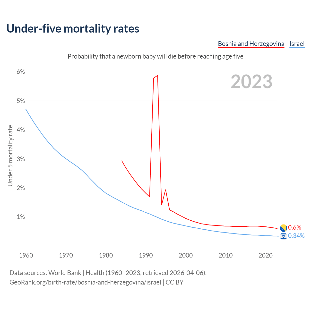 The chance that a newborn baby will die before reaching age five is 0.6% in Bosnia and Herzegovina and 0.34% in Israel. Above is a chart with historical data on under-five mortality rates.