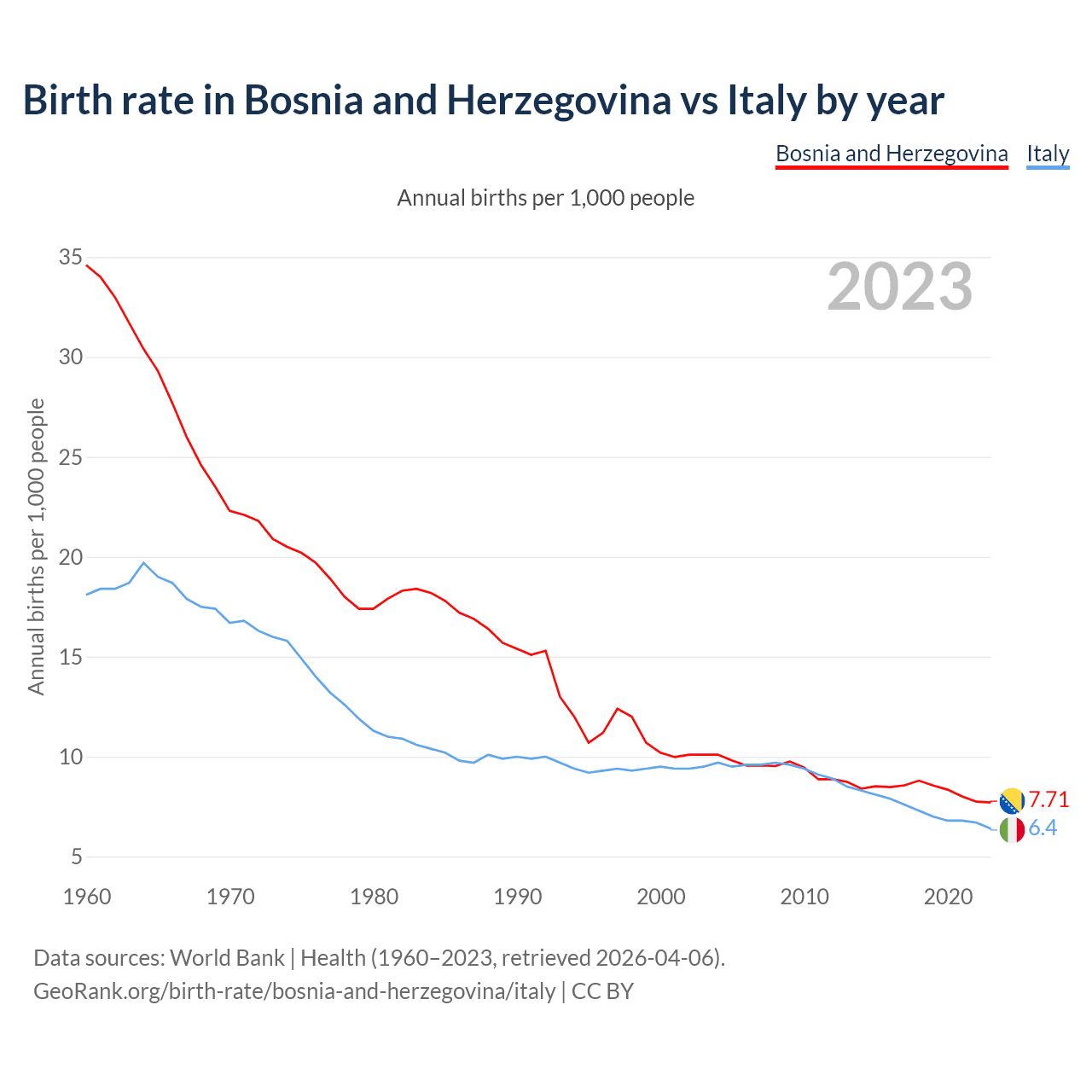 Bosnia and Herzegovina has an annual birth rate of 7.71 births per 1,000 people, compared to 6.4 for Italy. The average number of children a woman is expected to have during her lifetime — the fertility rate, is 1.49 in Bosnia and Herzegovina and 1.2 in Italy — 19.2% difference.