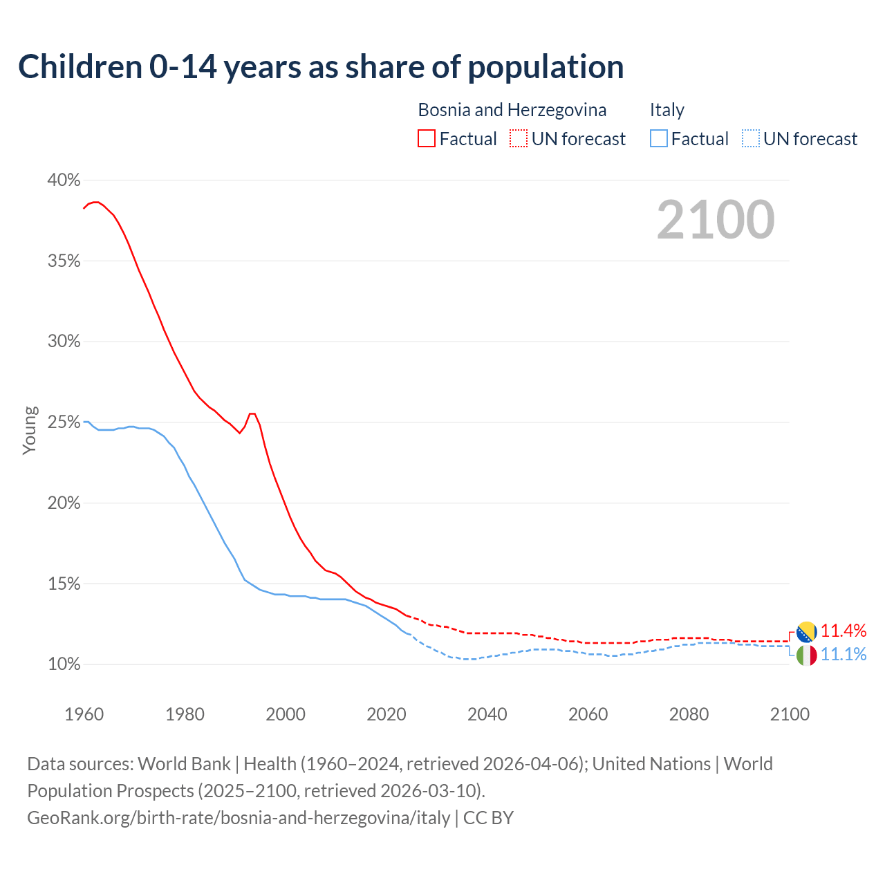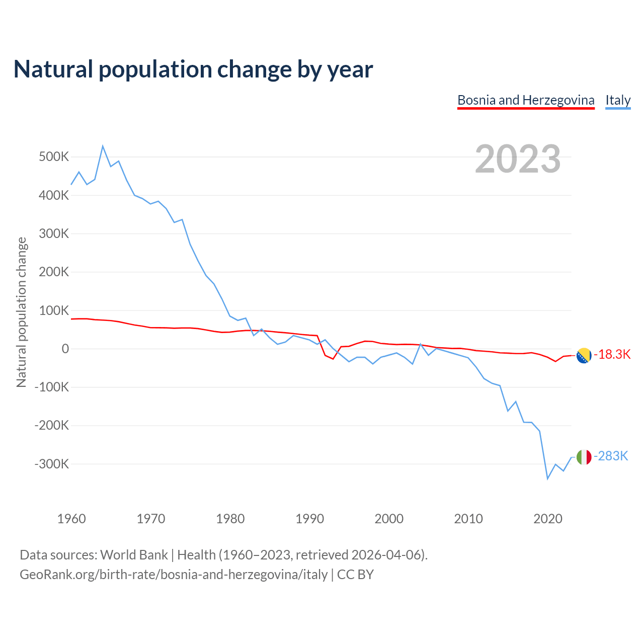 According to the latest available data on birth rates, the fertility rate in Bosnia and Herzegovina was 1.49 children per woman in 2023, compared to 1.2 in Italy in 2023. The replacement level is considered to be 2.1 children per woman.