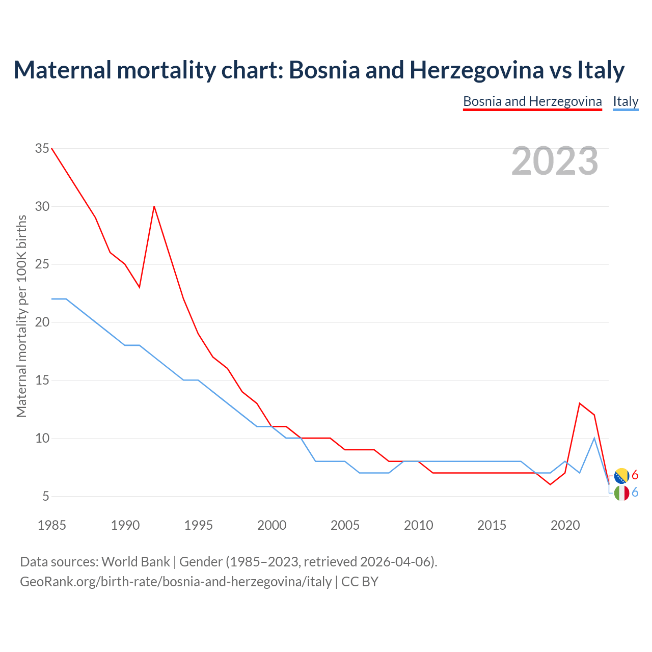 The maternal mortality rate, which is the probability of dying during childbirth or within 42 days of pregnancy termination, is 6 deaths per 100,000 live births in Bosnia and Herzegovina, compared to 6 deaths in Italy.