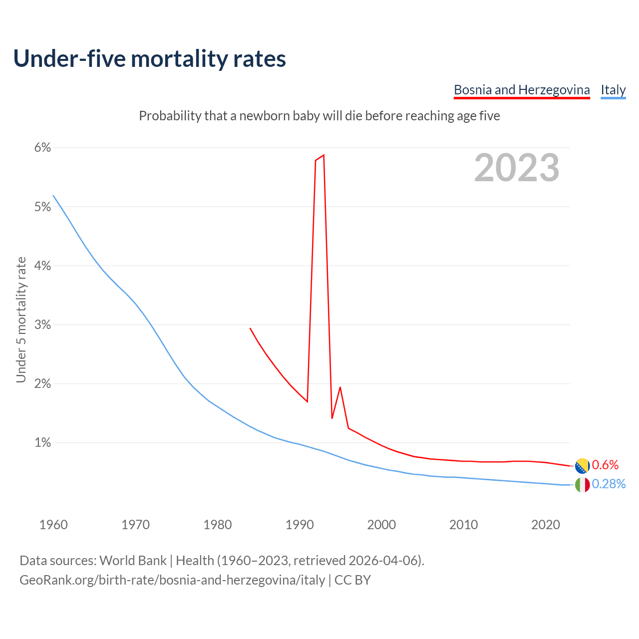 The chance that a newborn baby will die before reaching age five is 0.6% in Bosnia and Herzegovina and 0.28% in Italy. Above is a chart with historical data on under-five mortality rates.