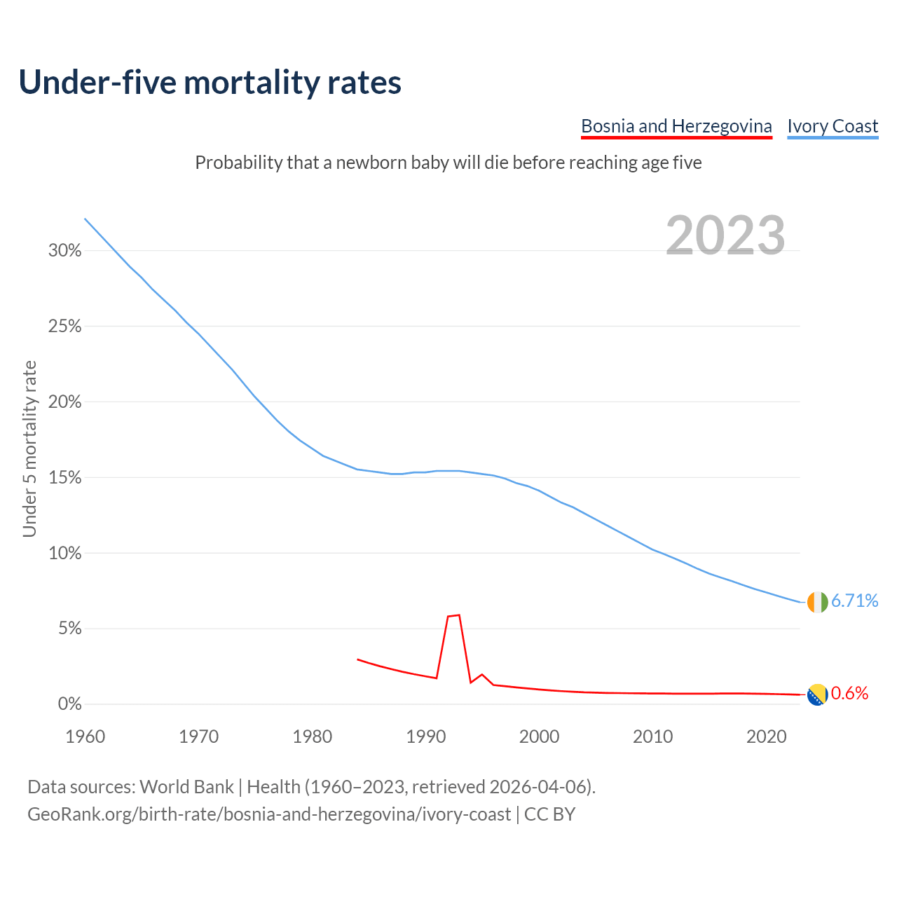 The chance that a newborn baby will die before reaching age five is 0.6% in Bosnia and Herzegovina and 6.71% in Ivory Coast. Above is a chart with historical data on under-five mortality rates.
