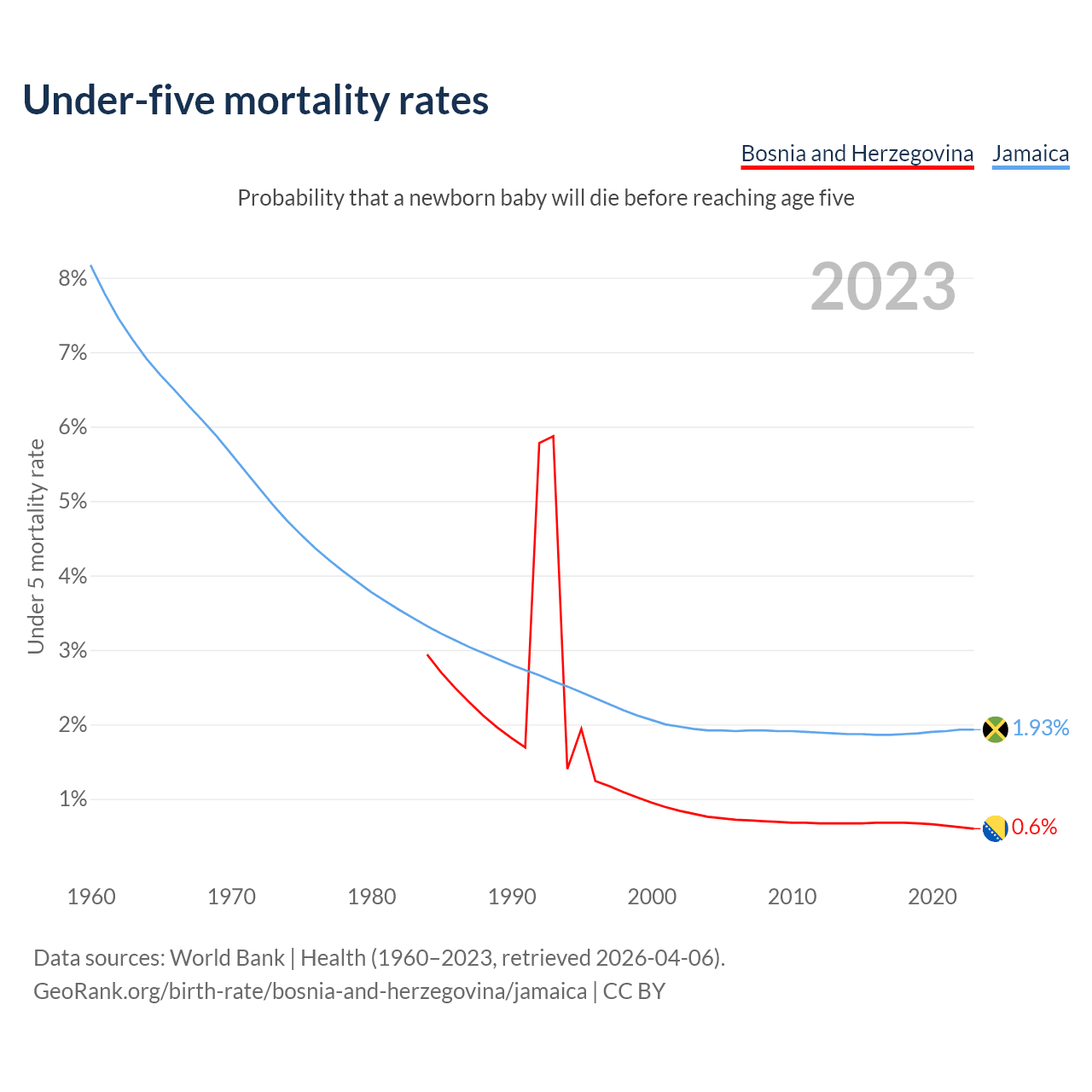 The chance that a newborn baby will die before reaching age five is 0.6% in Bosnia and Herzegovina and 1.93% in Jamaica. Above is a chart with historical data on under-five mortality rates.