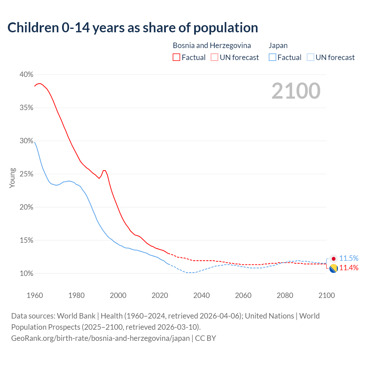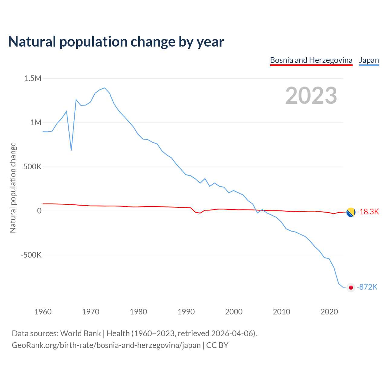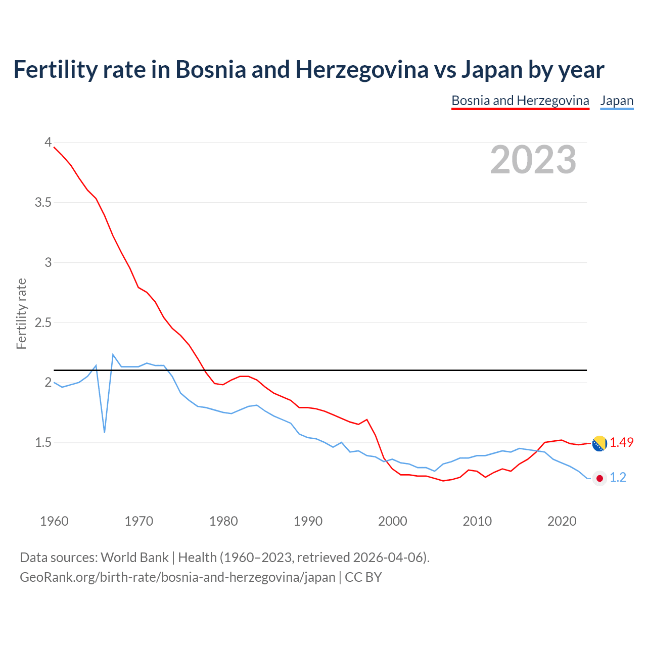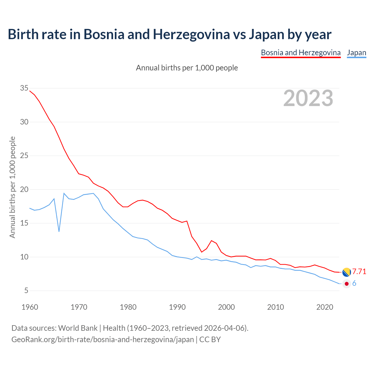 Bosnia and Herzegovina has an annual birth rate of 7.71 births per 1,000 people, compared to 6 for Japan. The average number of children a woman is expected to have during her lifetime — the fertility rate, is 1.49 in Bosnia and Herzegovina and 1.2 in Japan — 19.2% difference.
