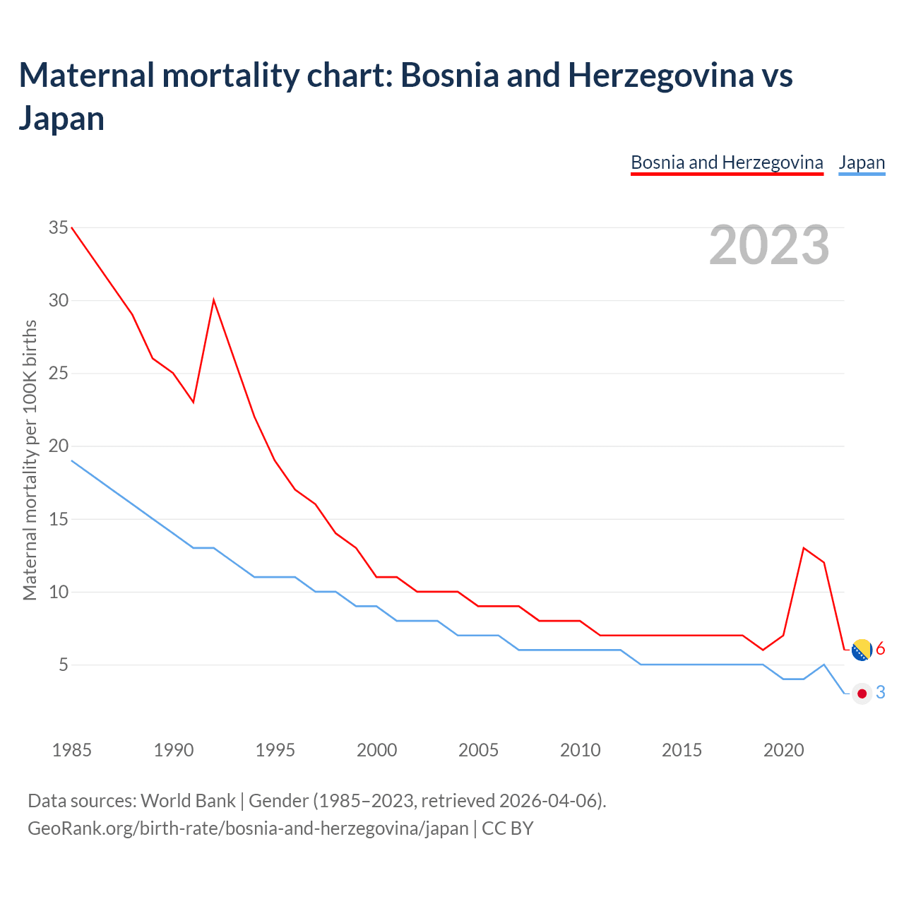 The maternal mortality rate, which is the probability of dying during childbirth or within 42 days of pregnancy termination, is 6 deaths per 100,000 live births in Bosnia and Herzegovina, compared to 3 deaths in Japan.