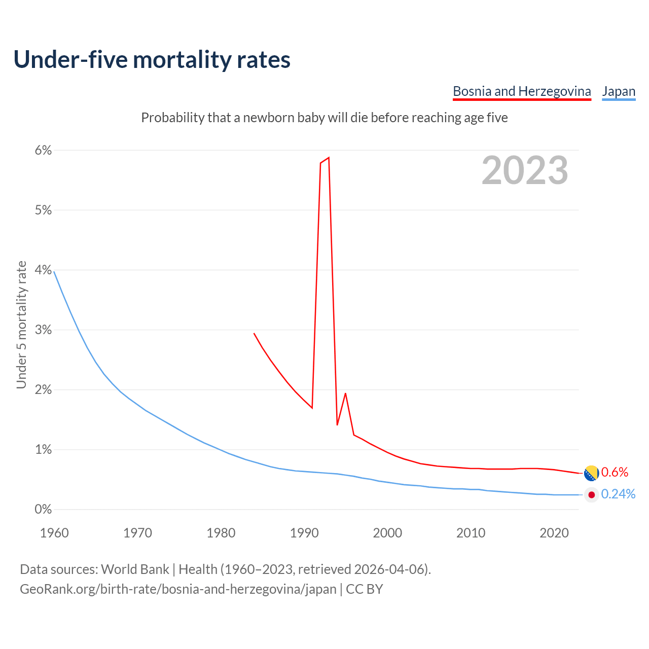 The chance that a newborn baby will die before reaching age five is 0.6% in Bosnia and Herzegovina and 0.24% in Japan. Above is a chart with historical data on under-five mortality rates.