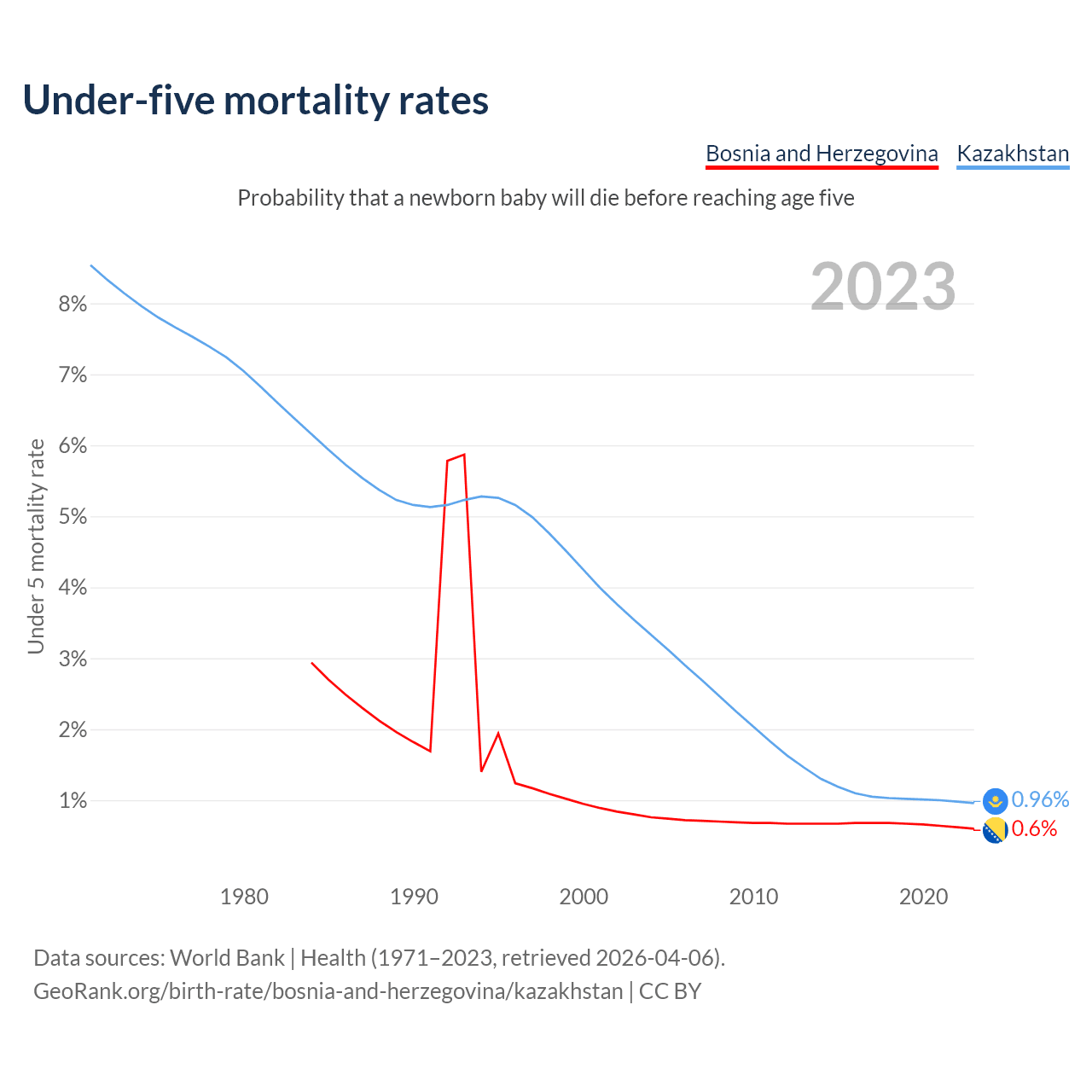 The chance that a newborn baby will die before reaching age five is 0.6% in Bosnia and Herzegovina and 0.96% in Kazakhstan. Above is a chart with historical data on under-five mortality rates.