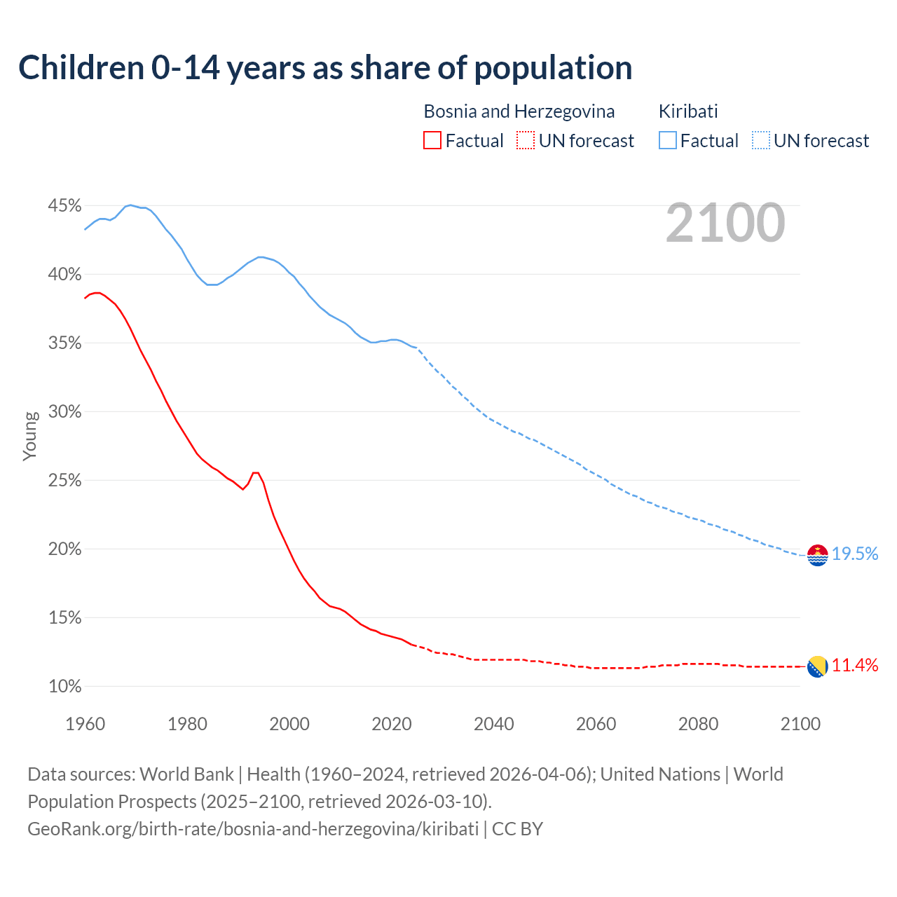 Bosnia and Herzegovina has an annual birth rate of 7.71 births per 1,000 people, compared to 25.8 for Kiribati. The average number of children a woman is expected to have during her lifetime — the fertility rate, is 1.49 in Bosnia and Herzegovina and 3.15 in Kiribati — 111.8% difference.