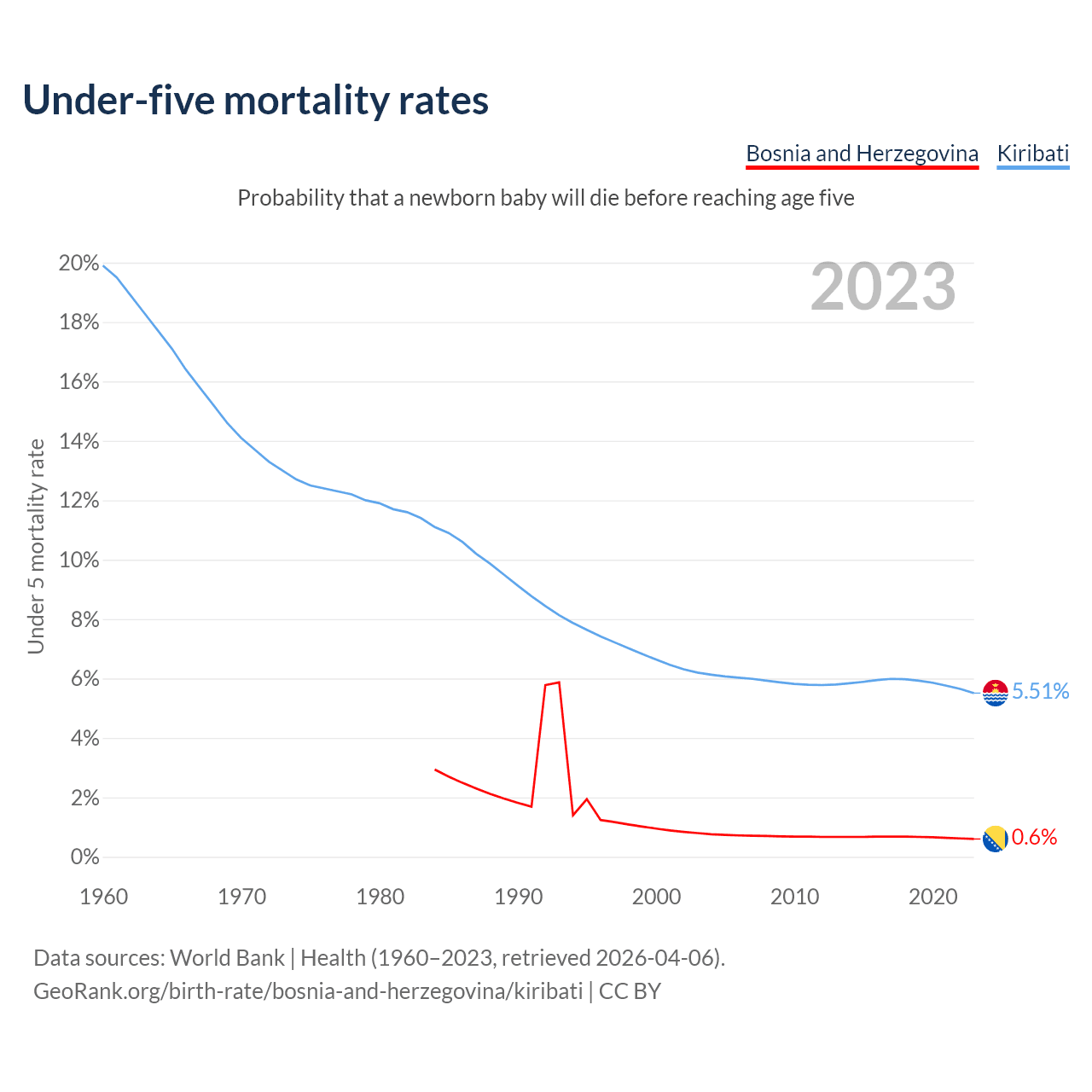 The chance that a newborn baby will die before reaching age five is 0.6% in Bosnia and Herzegovina and 5.51% in Kiribati. Above is a chart with historical data on under-five mortality rates.