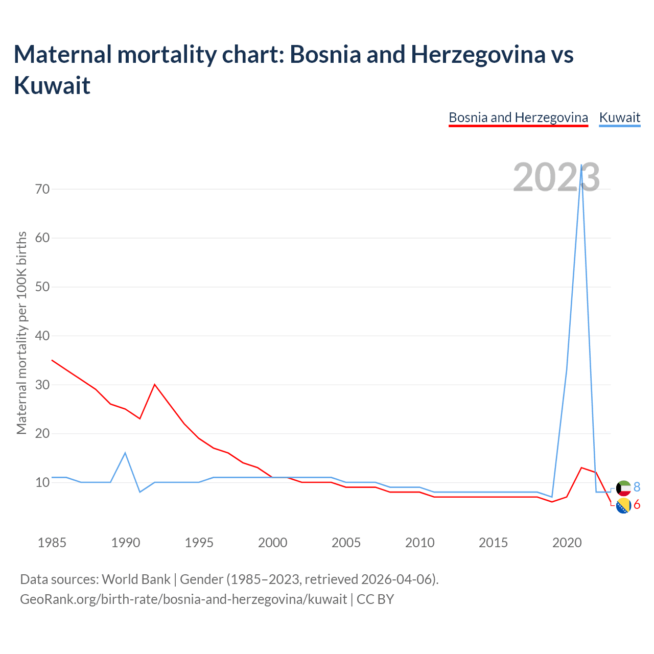 The maternal mortality rate, which is the probability of dying during childbirth or within 42 days of pregnancy termination, is 6 deaths per 100,000 live births in Bosnia and Herzegovina, compared to 8 deaths in Kuwait.