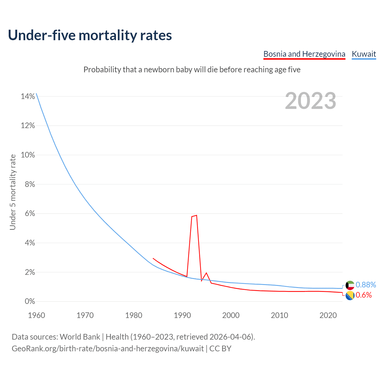 The chance that a newborn baby will die before reaching age five is 0.6% in Bosnia and Herzegovina and 0.88% in Kuwait. Above is a chart with historical data on under-five mortality rates.