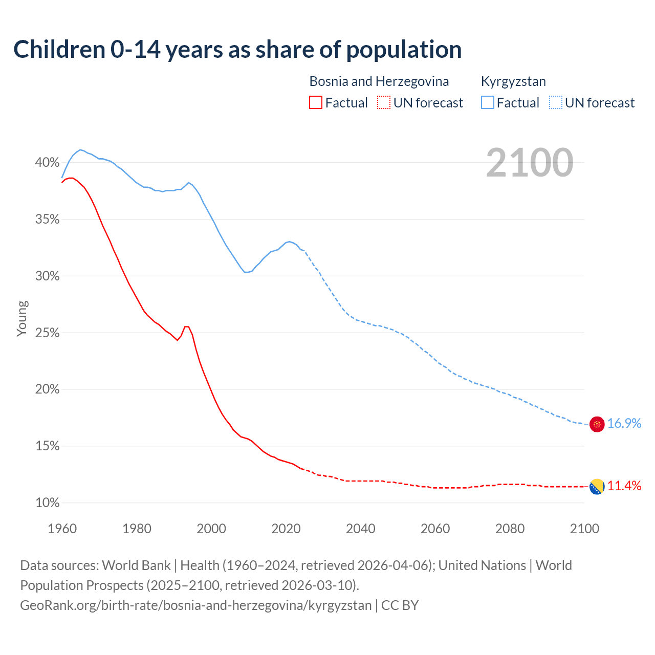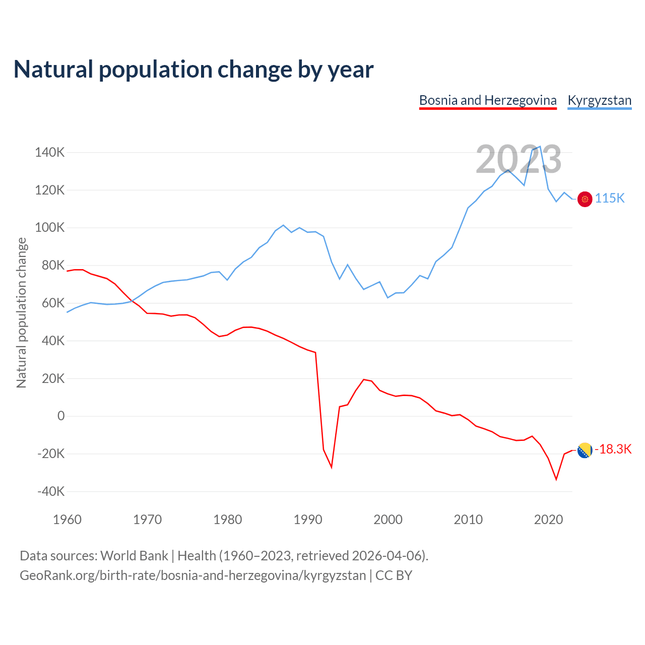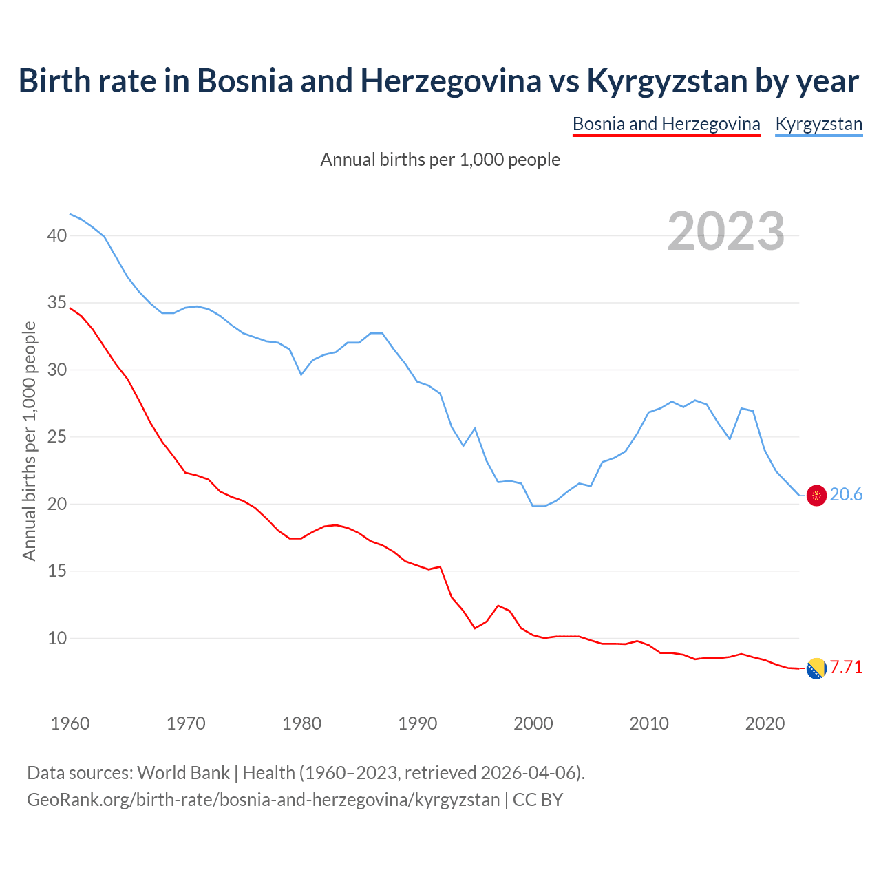 Bosnia and Herzegovina has an annual birth rate of 7.71 births per 1,000 people, compared to 20.6 for Kyrgyzstan. The average number of children a woman is expected to have during her lifetime — the fertility rate, is 1.49 in Bosnia and Herzegovina and 2.7 in Kyrgyzstan — 81.7% difference.