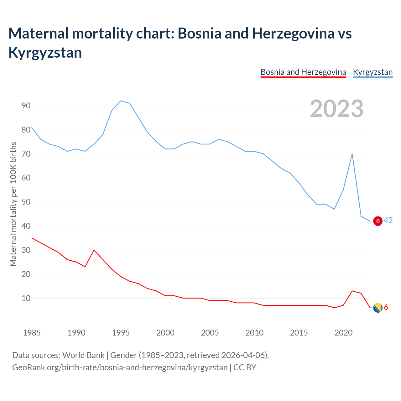 The maternal mortality rate, which is the probability of dying during childbirth or within 42 days of pregnancy termination, is 6 deaths per 100,000 live births in Bosnia and Herzegovina, compared to 42 deaths in Kyrgyzstan.
