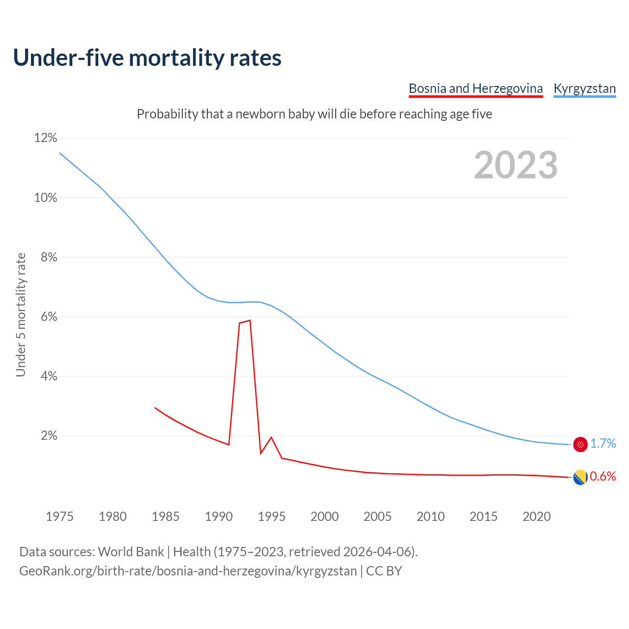 The chance that a newborn baby will die before reaching age five is 0.6% in Bosnia and Herzegovina and 1.7% in Kyrgyzstan. Above is a chart with historical data on under-five mortality rates.