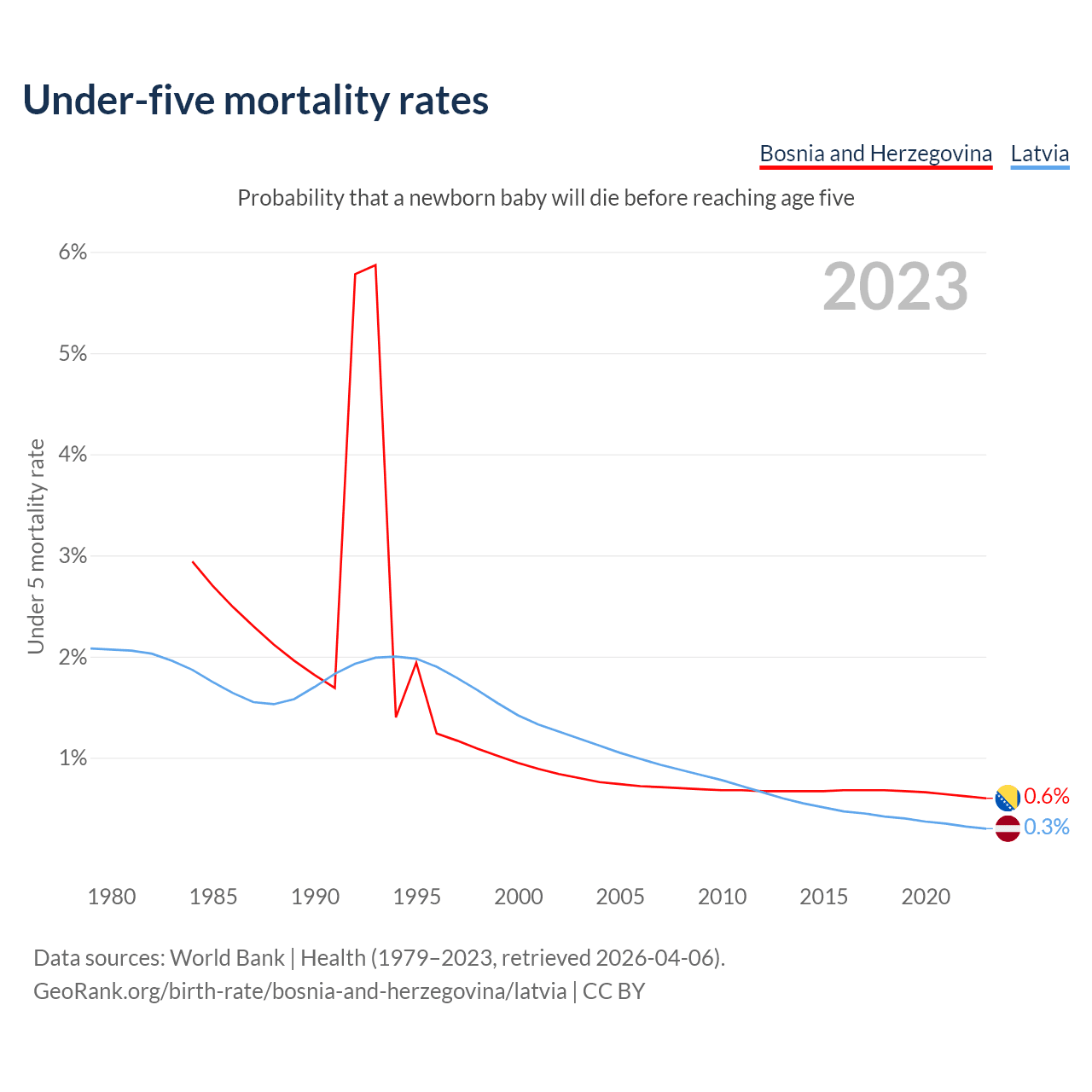 The chance that a newborn baby will die before reaching age five is 0.6% in Bosnia and Herzegovina and 0.3% in Latvia. Above is a chart with historical data on under-five mortality rates.