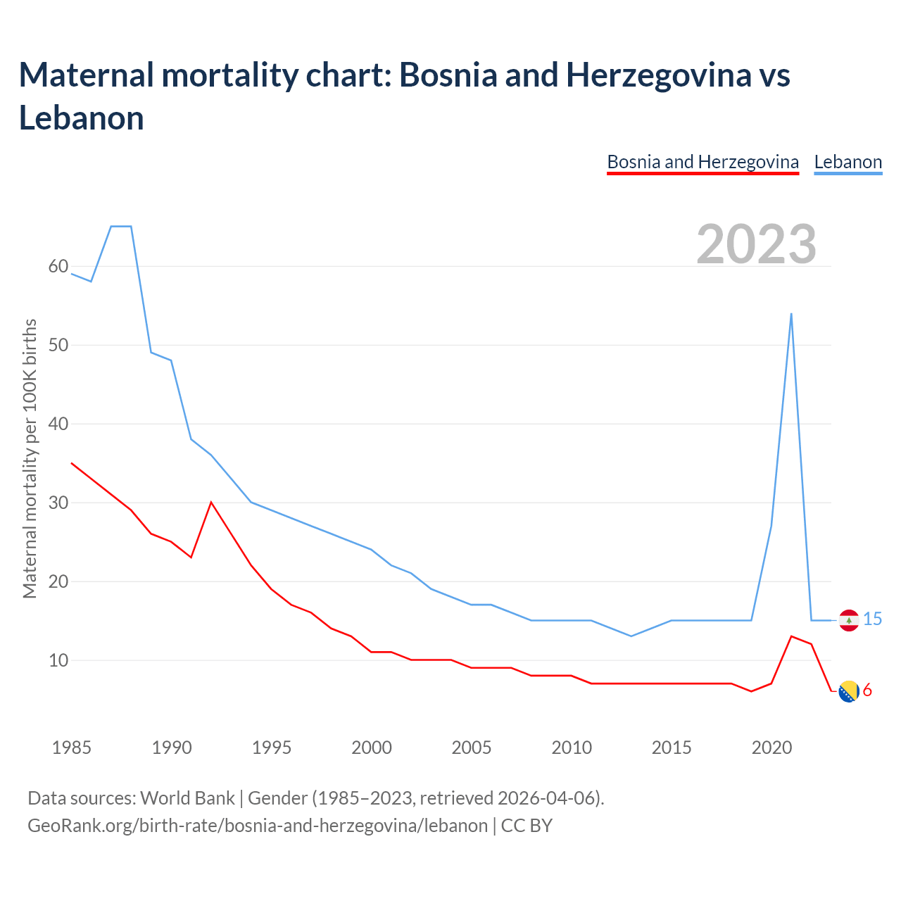 The maternal mortality rate, which is the probability of dying during childbirth or within 42 days of pregnancy termination, is 6 deaths per 100,000 live births in Bosnia and Herzegovina, compared to 15 deaths in Lebanon.