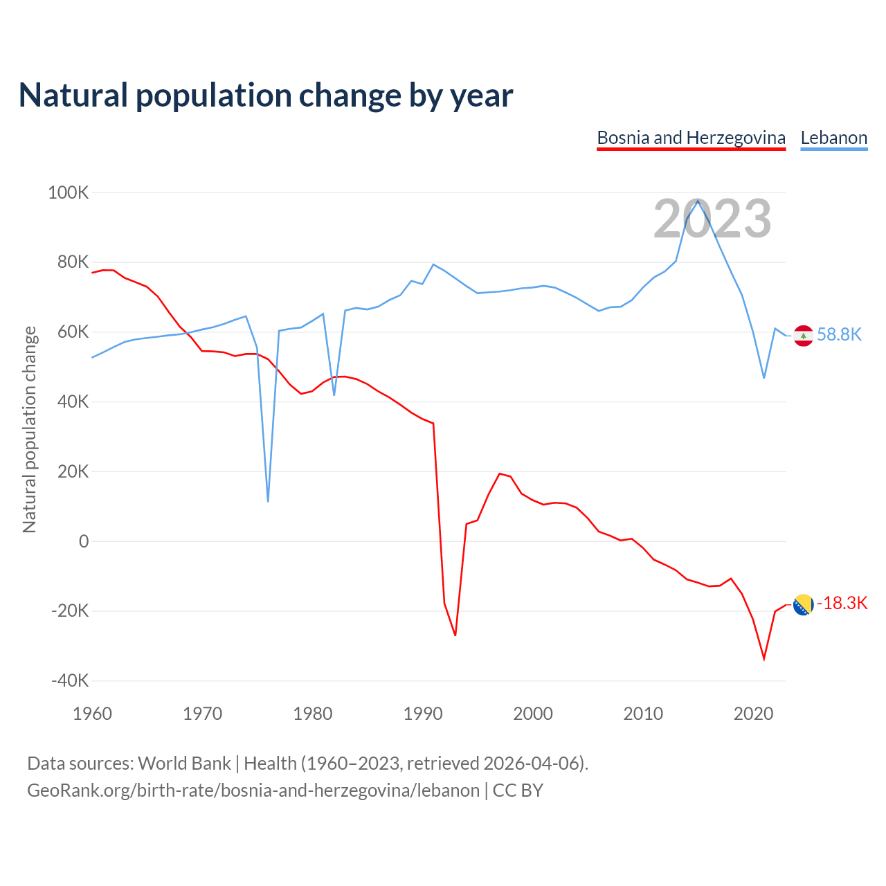 Bosnia and Herzegovina has an annual birth rate of 7.71 births per 1,000 people, compared to 16.1 for Lebanon. The average number of children a woman is expected to have during her lifetime — the fertility rate, is 1.49 in Bosnia and Herzegovina and 2.24 in Lebanon — 50.7% difference.