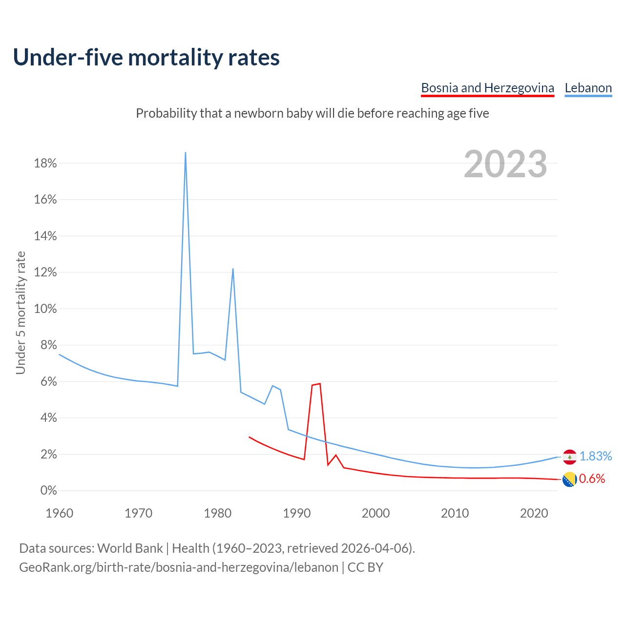 The chance that a newborn baby will die before reaching age five is 0.6% in Bosnia and Herzegovina and 1.83% in Lebanon. Above is a chart with historical data on under-five mortality rates.
