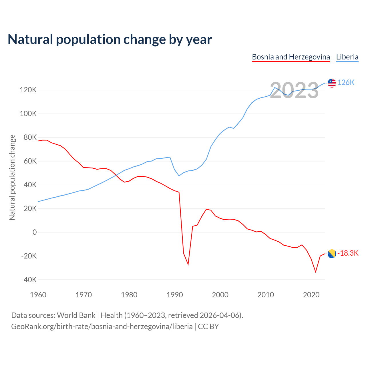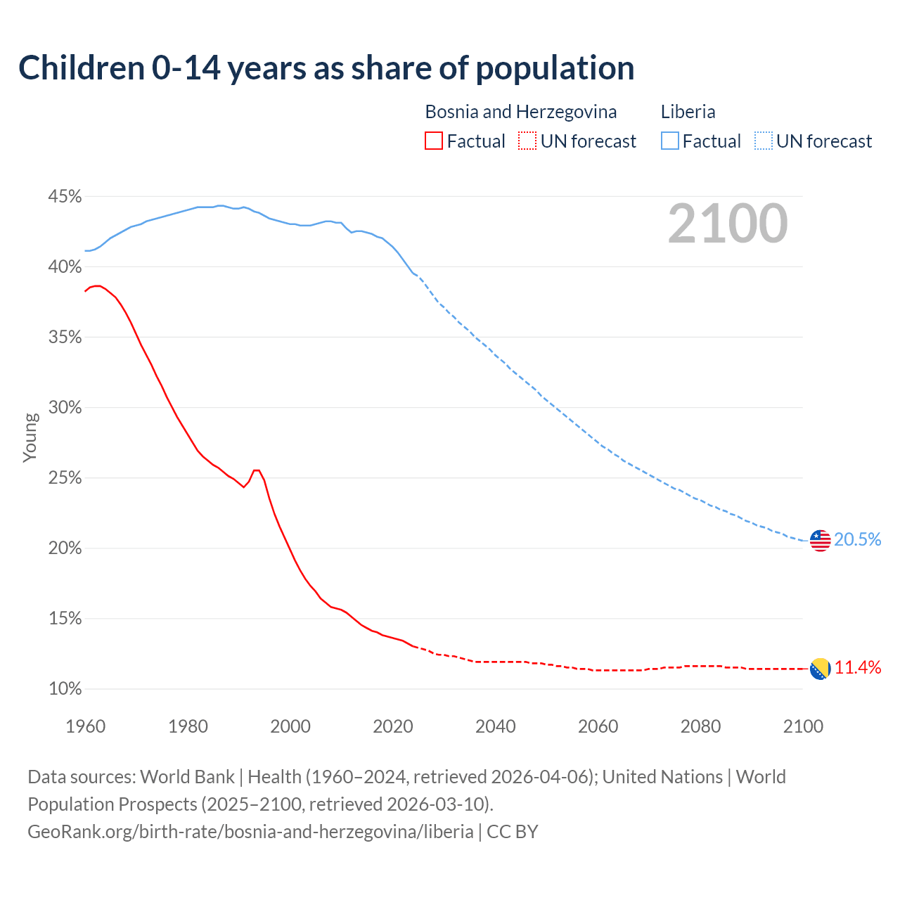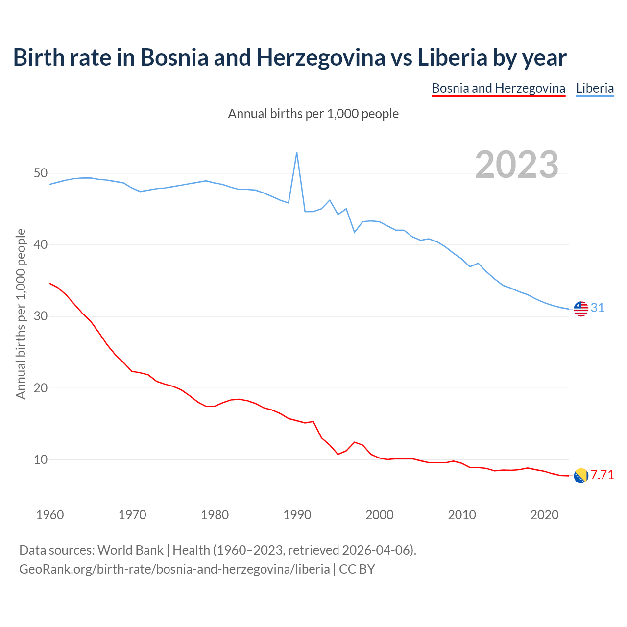 Bosnia and Herzegovina has an annual birth rate of 7.71 births per 1,000 people, compared to 31 for Liberia. The average number of children a woman is expected to have during her lifetime — the fertility rate, is 1.49 in Bosnia and Herzegovina and 3.95 in Liberia — 165.8% difference.