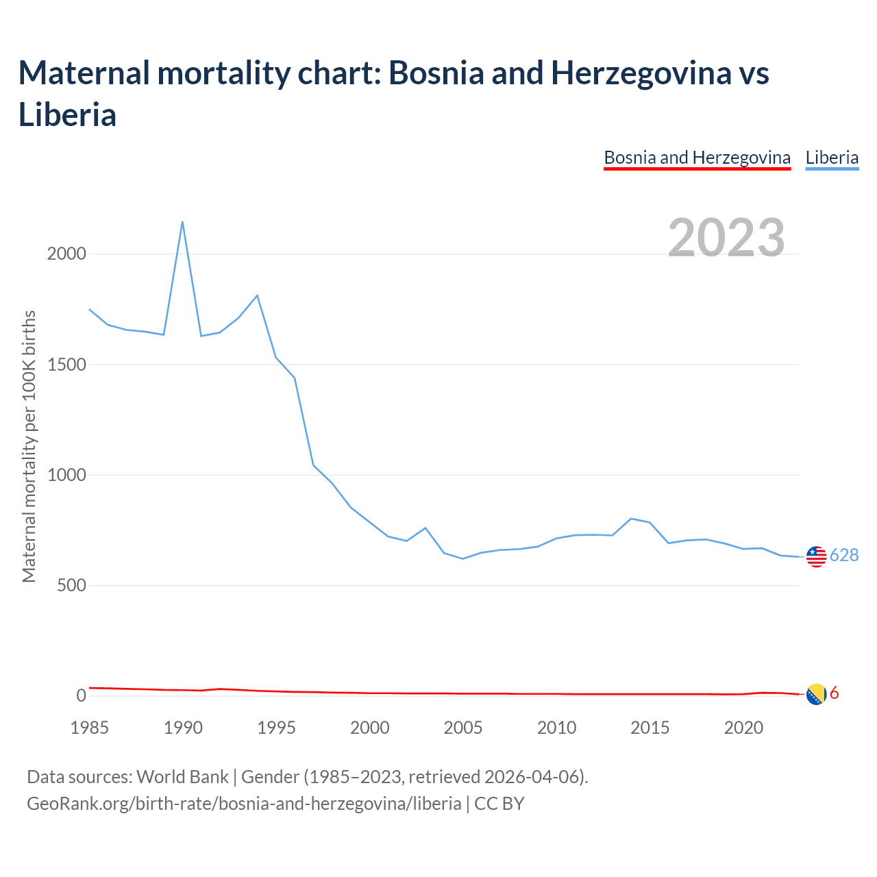 The maternal mortality rate, which is the probability of dying during childbirth or within 42 days of pregnancy termination, is 6 deaths per 100,000 live births in Bosnia and Herzegovina, compared to 628 deaths in Liberia.