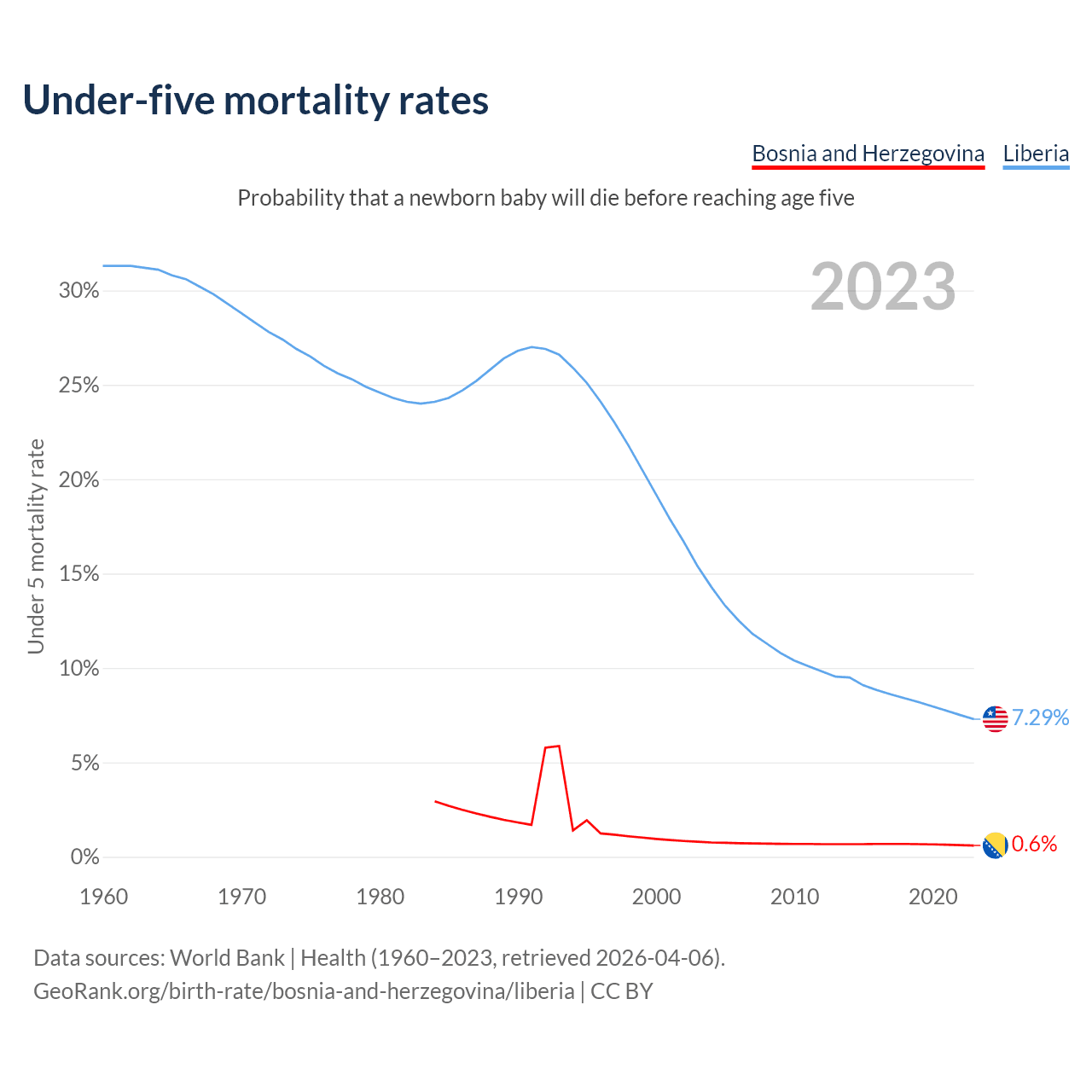 The chance that a newborn baby will die before reaching age five is 0.6% in Bosnia and Herzegovina and 7.29% in Liberia. Above is a chart with historical data on under-five mortality rates.