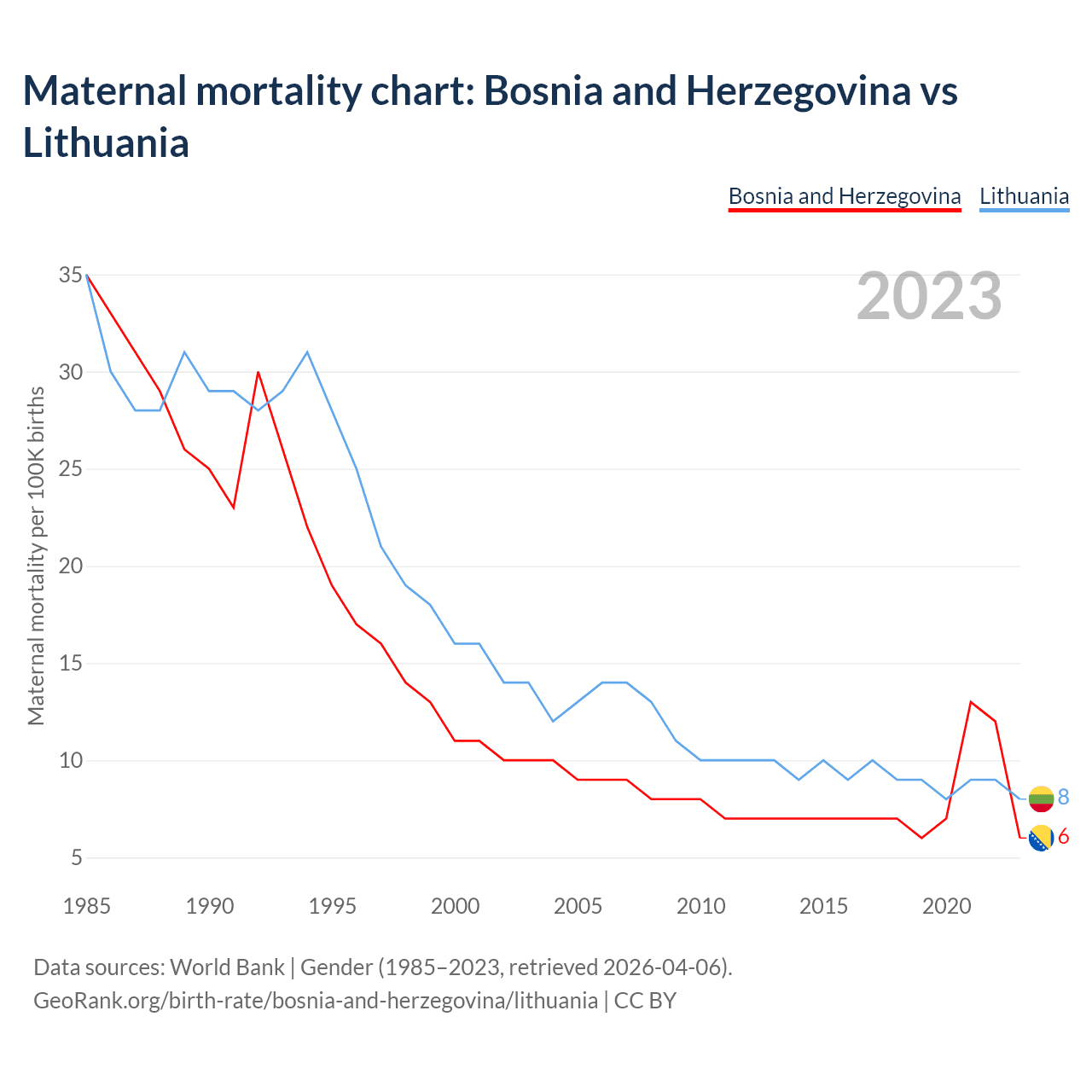 The maternal mortality rate, which is the probability of dying during childbirth or within 42 days of pregnancy termination, is 6 deaths per 100,000 live births in Bosnia and Herzegovina, compared to 8 deaths in Lithuania.