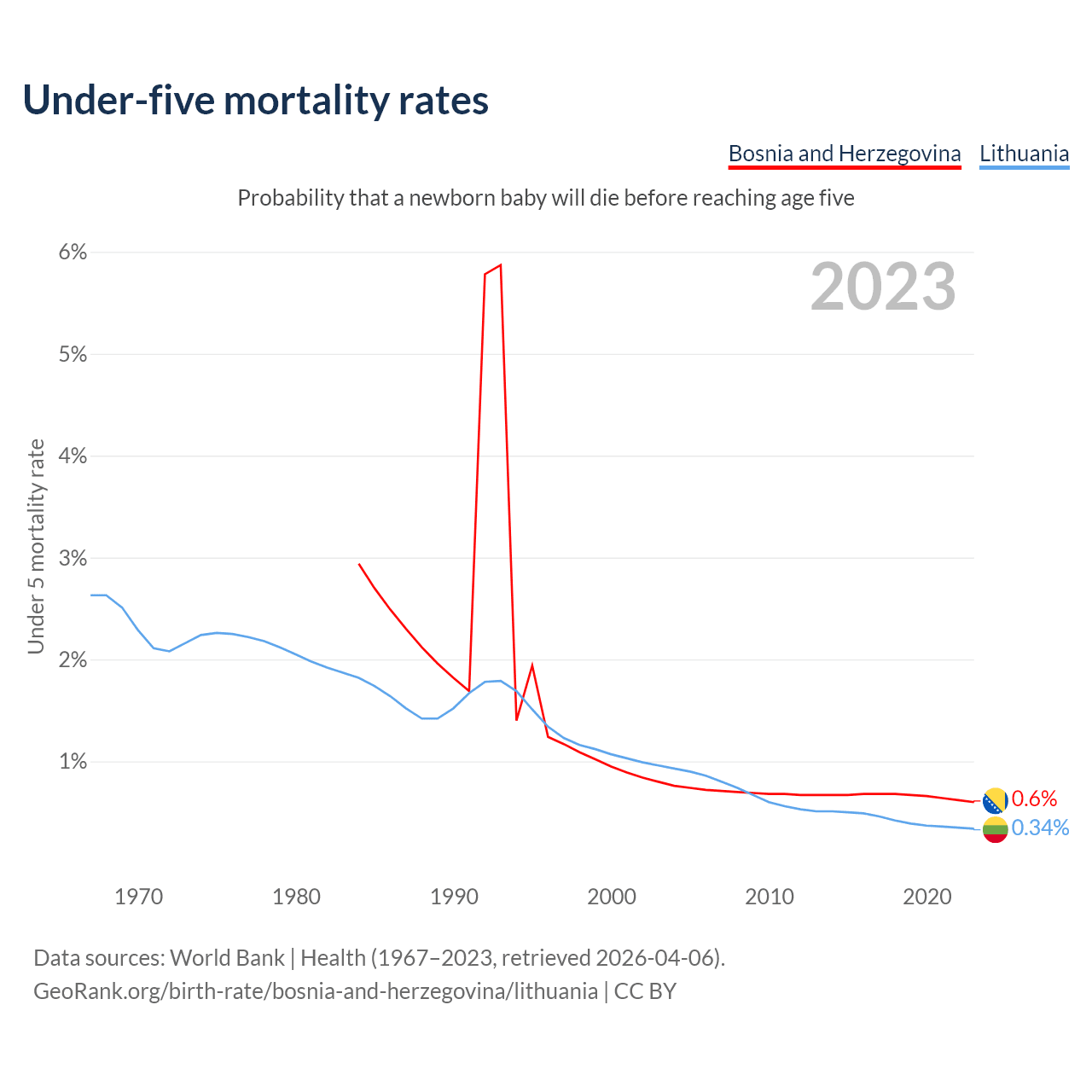 The chance that a newborn baby will die before reaching age five is 0.6% in Bosnia and Herzegovina and 0.34% in Lithuania. Above is a chart with historical data on under-five mortality rates.