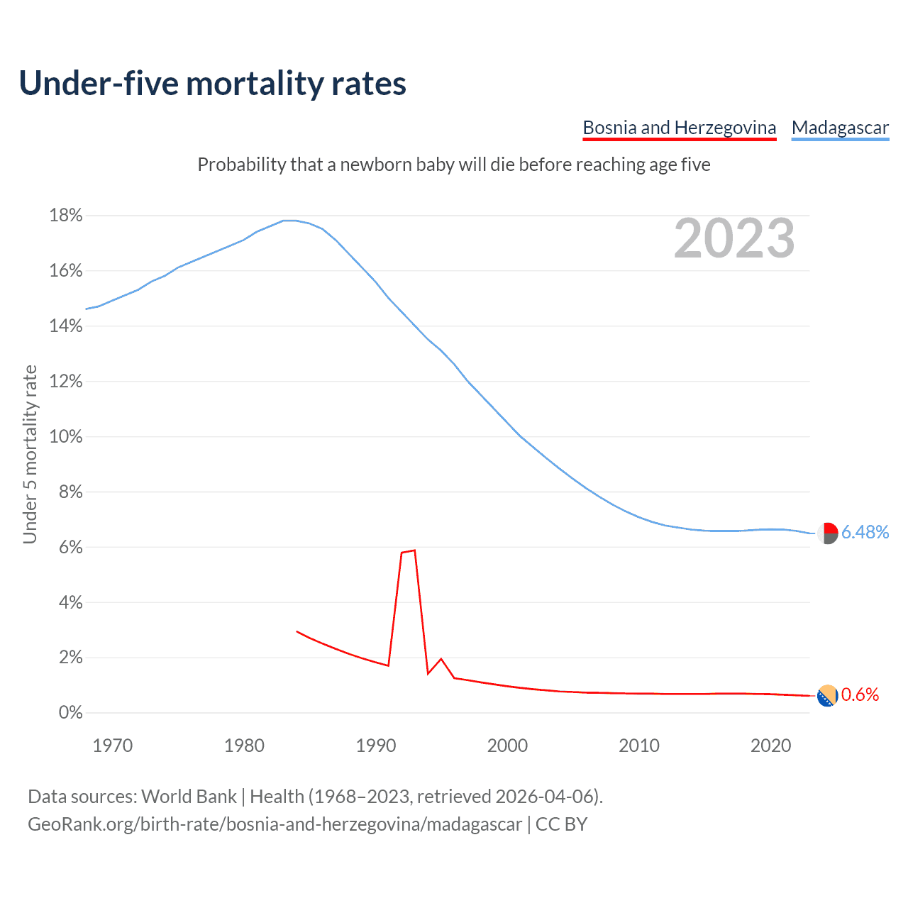The chance that a newborn baby will die before reaching age five is 0.6% in Bosnia and Herzegovina and 6.48% in Madagascar. Above is a chart with historical data on under-five mortality rates.