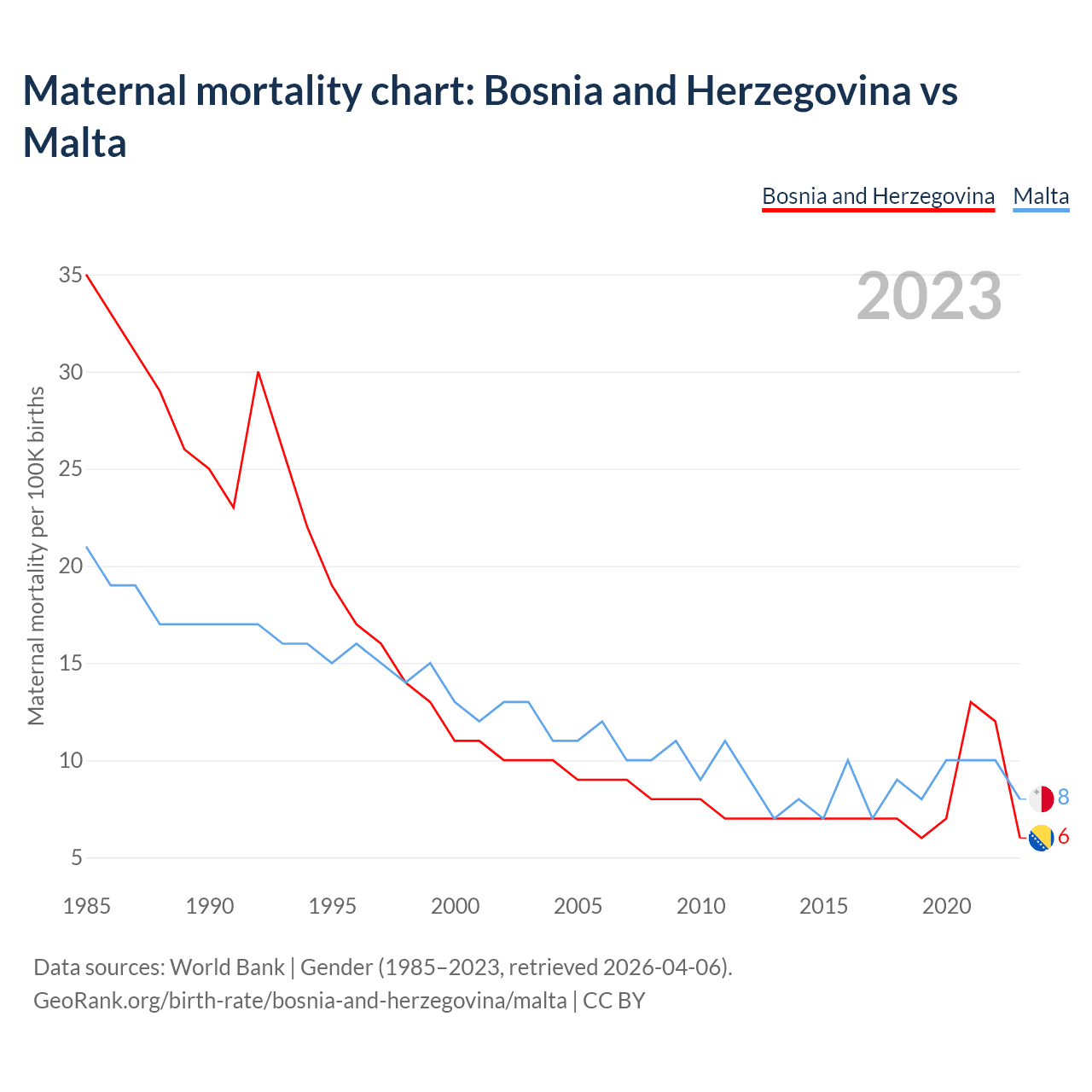 The maternal mortality rate, which is the probability of dying during childbirth or within 42 days of pregnancy termination, is 6 deaths per 100,000 live births in Bosnia and Herzegovina, compared to 8 deaths in Malta.