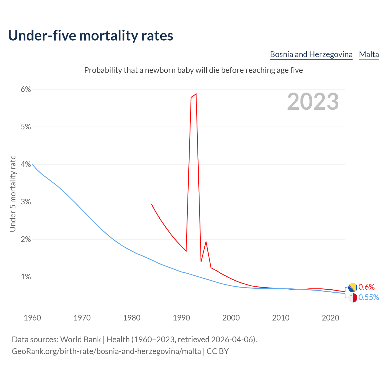The chance that a newborn baby will die before reaching age five is 0.6% in Bosnia and Herzegovina and 0.55% in Malta. Above is a chart with historical data on under-five mortality rates.