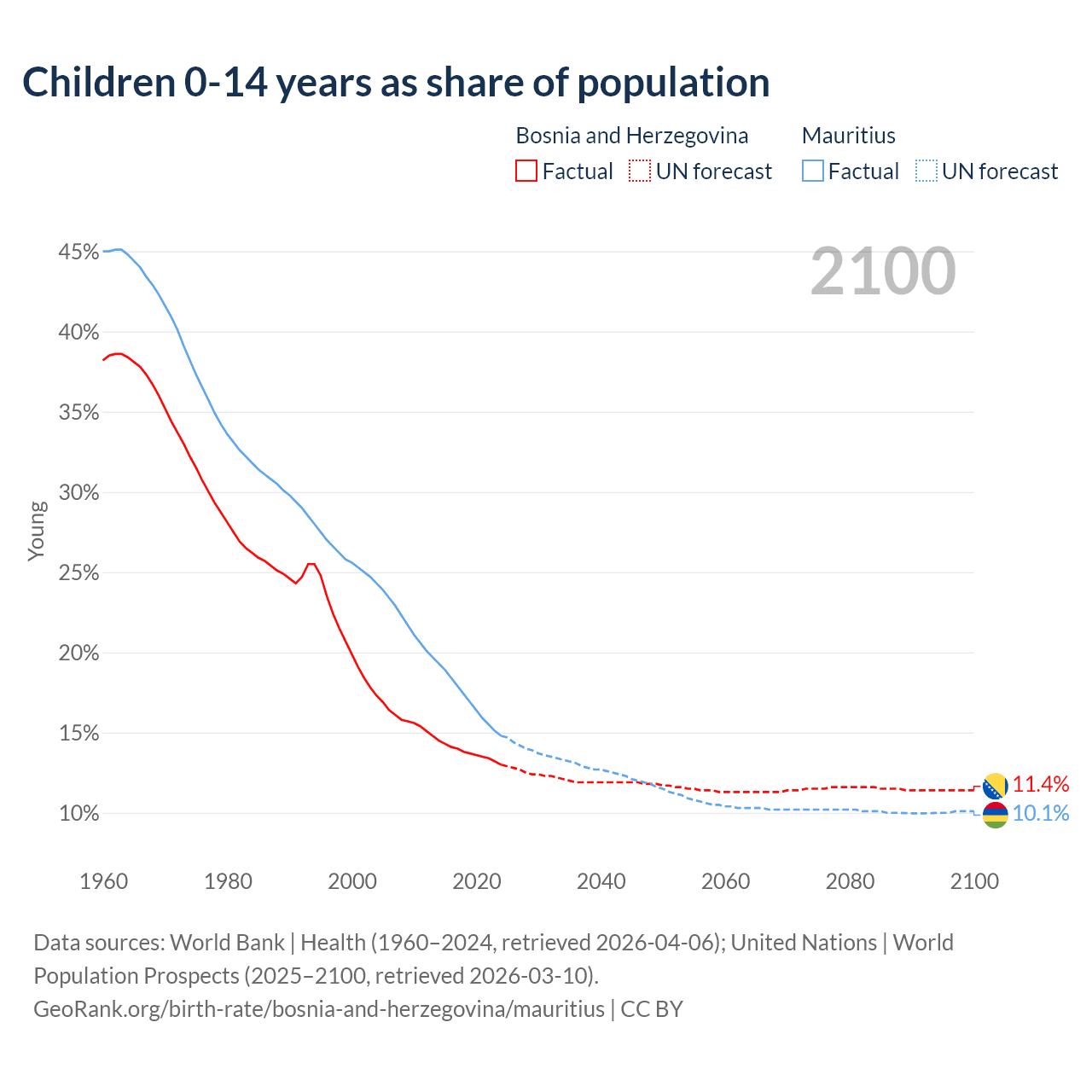 According to the latest available data on birth rates, the fertility rate in Bosnia and Herzegovina was 1.49 children per woman in 2023, compared to 1.39 in Mauritius in 2023. The replacement level is considered to be 2.1 children per woman.