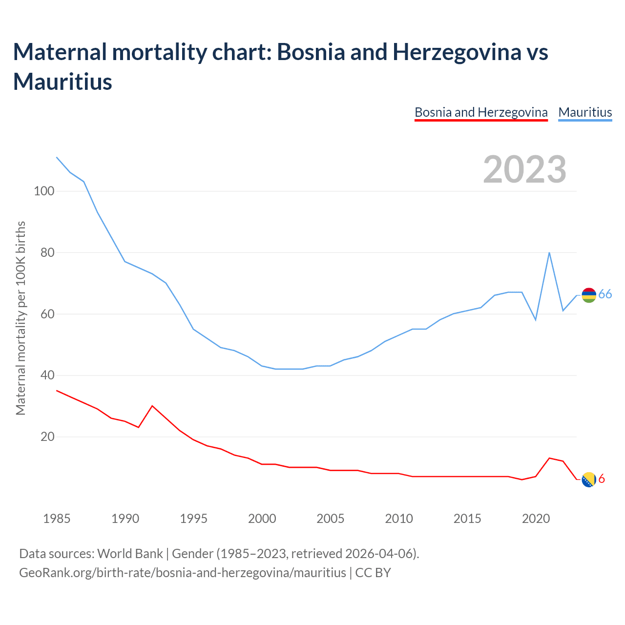 The maternal mortality rate, which is the probability of dying during childbirth or within 42 days of pregnancy termination, is 6 deaths per 100,000 live births in Bosnia and Herzegovina, compared to 66 deaths in Mauritius.