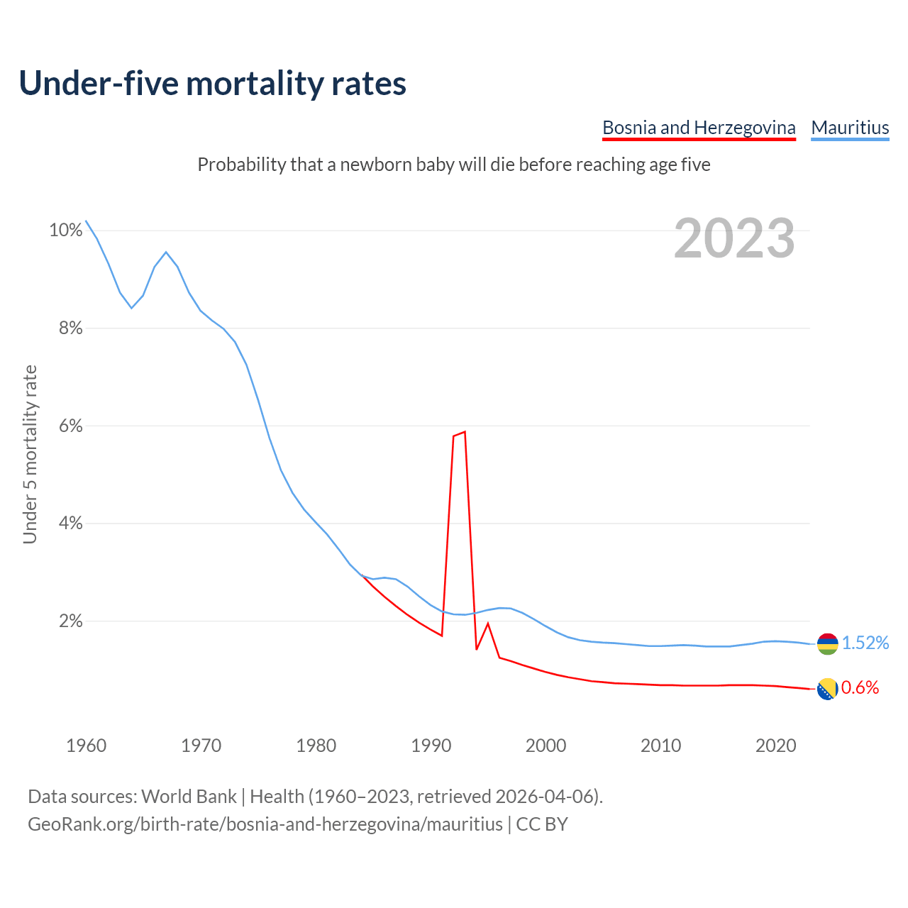 The chance that a newborn baby will die before reaching age five is 0.6% in Bosnia and Herzegovina and 1.52% in Mauritius. Above is a chart with historical data on under-five mortality rates.