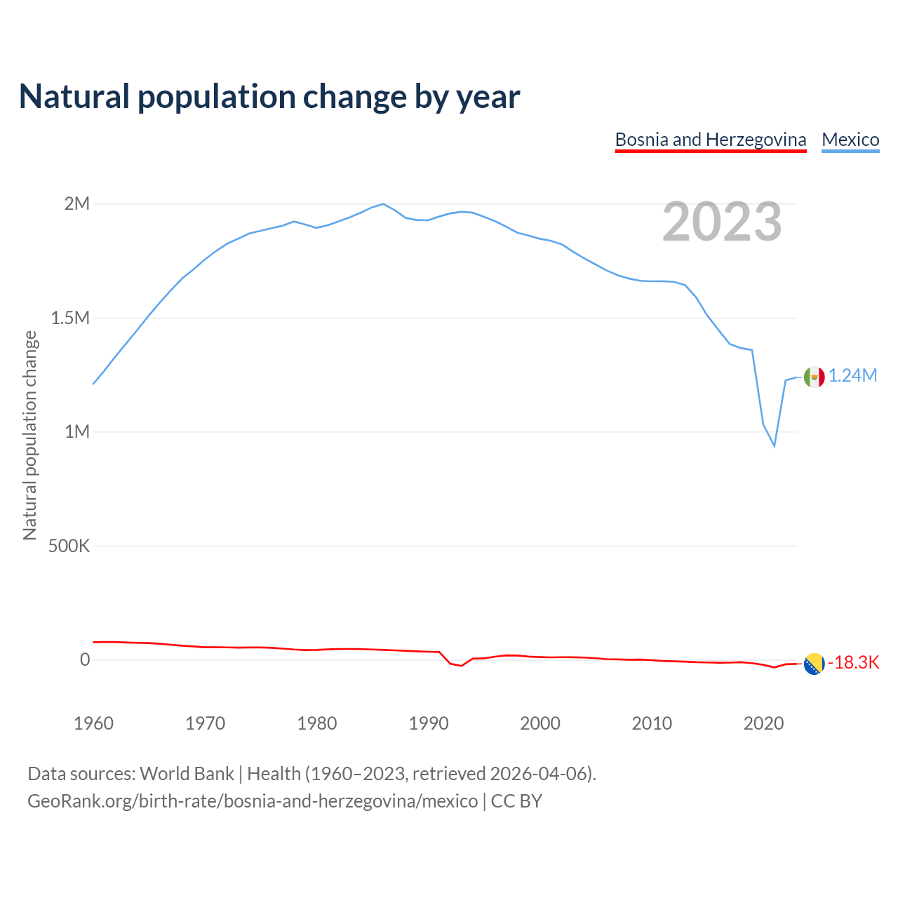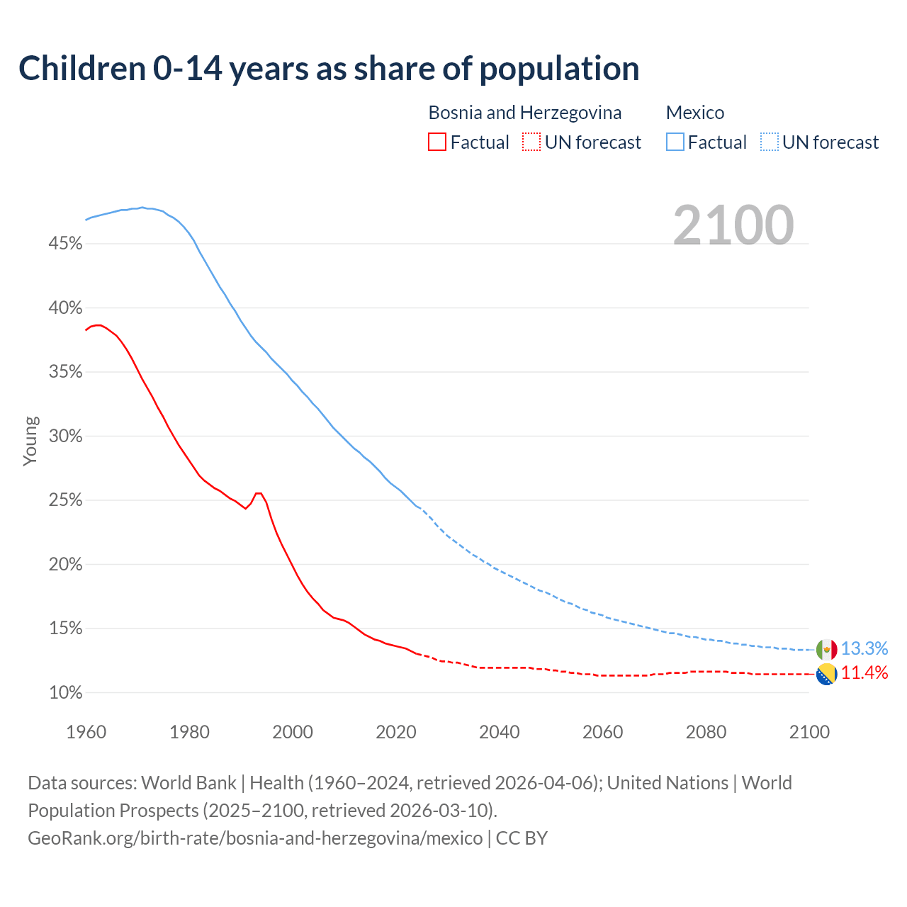 Bosnia and Herzegovina has an annual birth rate of 7.71 births per 1,000 people, compared to 15.7 for Mexico. The average number of children a woman is expected to have during her lifetime — the fertility rate, is 1.49 in Bosnia and Herzegovina and 1.91 in Mexico — 28.5% difference.