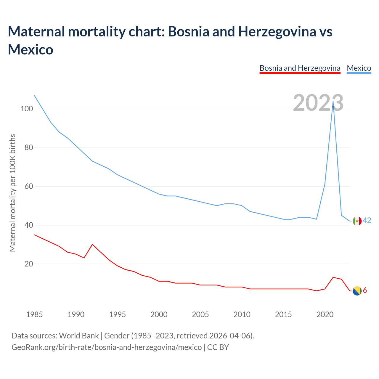 The maternal mortality rate, which is the probability of dying during childbirth or within 42 days of pregnancy termination, is 6 deaths per 100,000 live births in Bosnia and Herzegovina, compared to 42 deaths in Mexico.