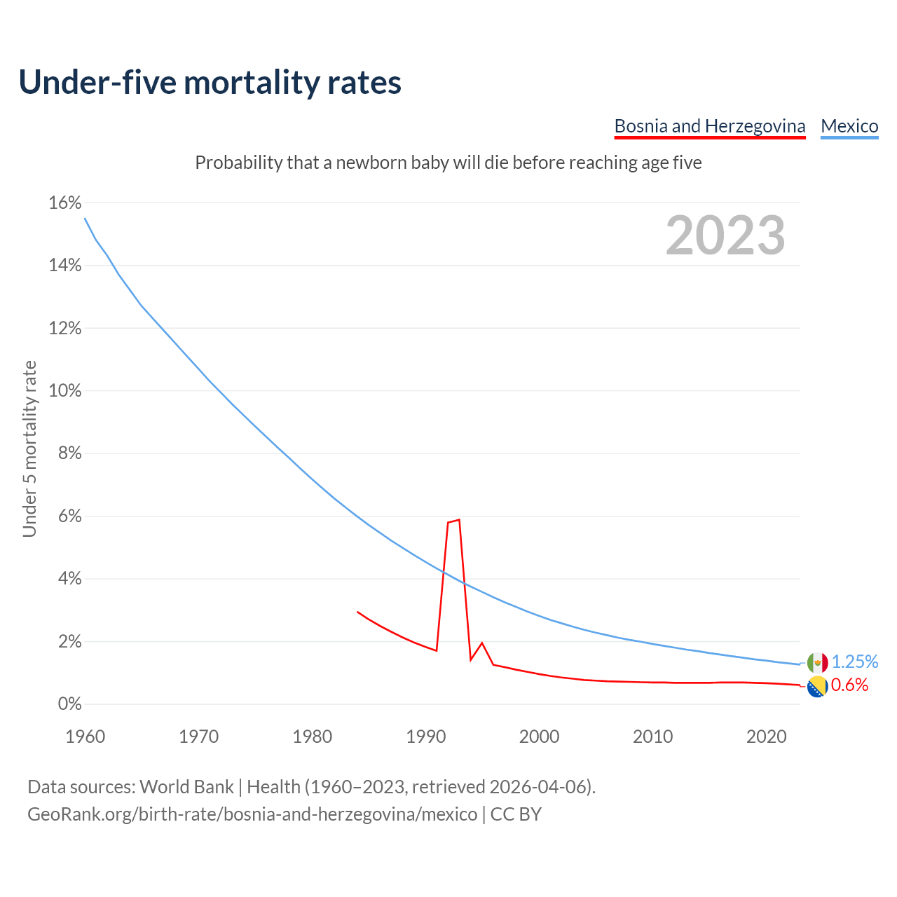 The chance that a newborn baby will die before reaching age five is 0.6% in Bosnia and Herzegovina and 1.25% in Mexico. Above is a chart with historical data on under-five mortality rates.