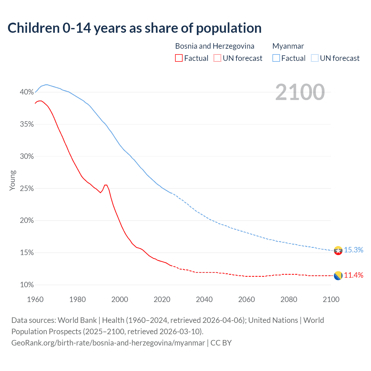 According to the latest available data on birth rates, the fertility rate in Bosnia and Herzegovina was 1.49 children per woman in 2023, compared to 2.12 in Myanmar in 2023. The replacement level is considered to be 2.1 children per woman.