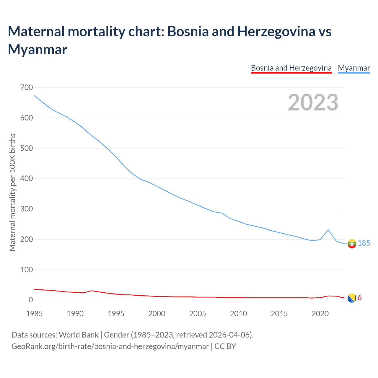 The maternal mortality rate, which is the probability of dying during childbirth or within 42 days of pregnancy termination, is 6 deaths per 100,000 live births in Bosnia and Herzegovina, compared to 185 deaths in Myanmar.