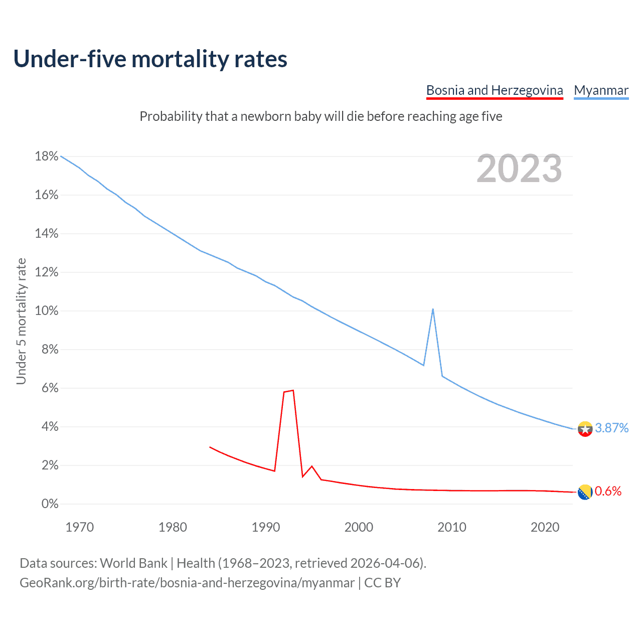 The chance that a newborn baby will die before reaching age five is 0.6% in Bosnia and Herzegovina and 3.87% in Myanmar. Above is a chart with historical data on under-five mortality rates.