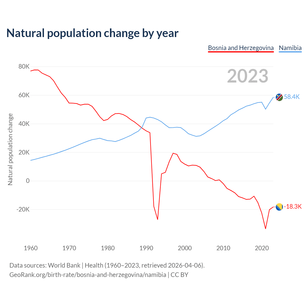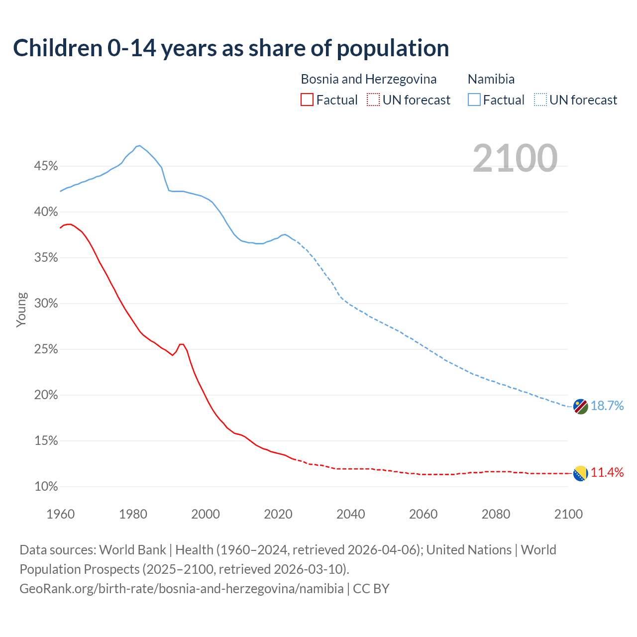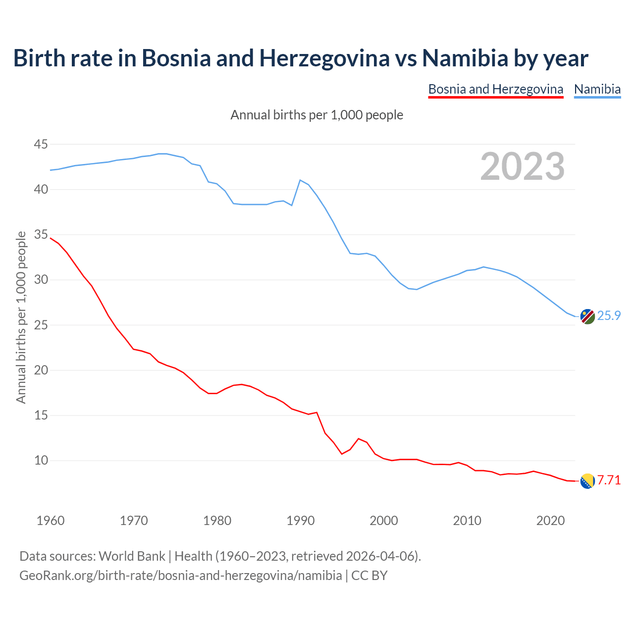 Bosnia and Herzegovina has an annual birth rate of 7.71 births per 1,000 people, compared to 25.9 for Namibia. The average number of children a woman is expected to have during her lifetime — the fertility rate, is 1.49 in Bosnia and Herzegovina and 3.21 in Namibia — 116.2% difference.