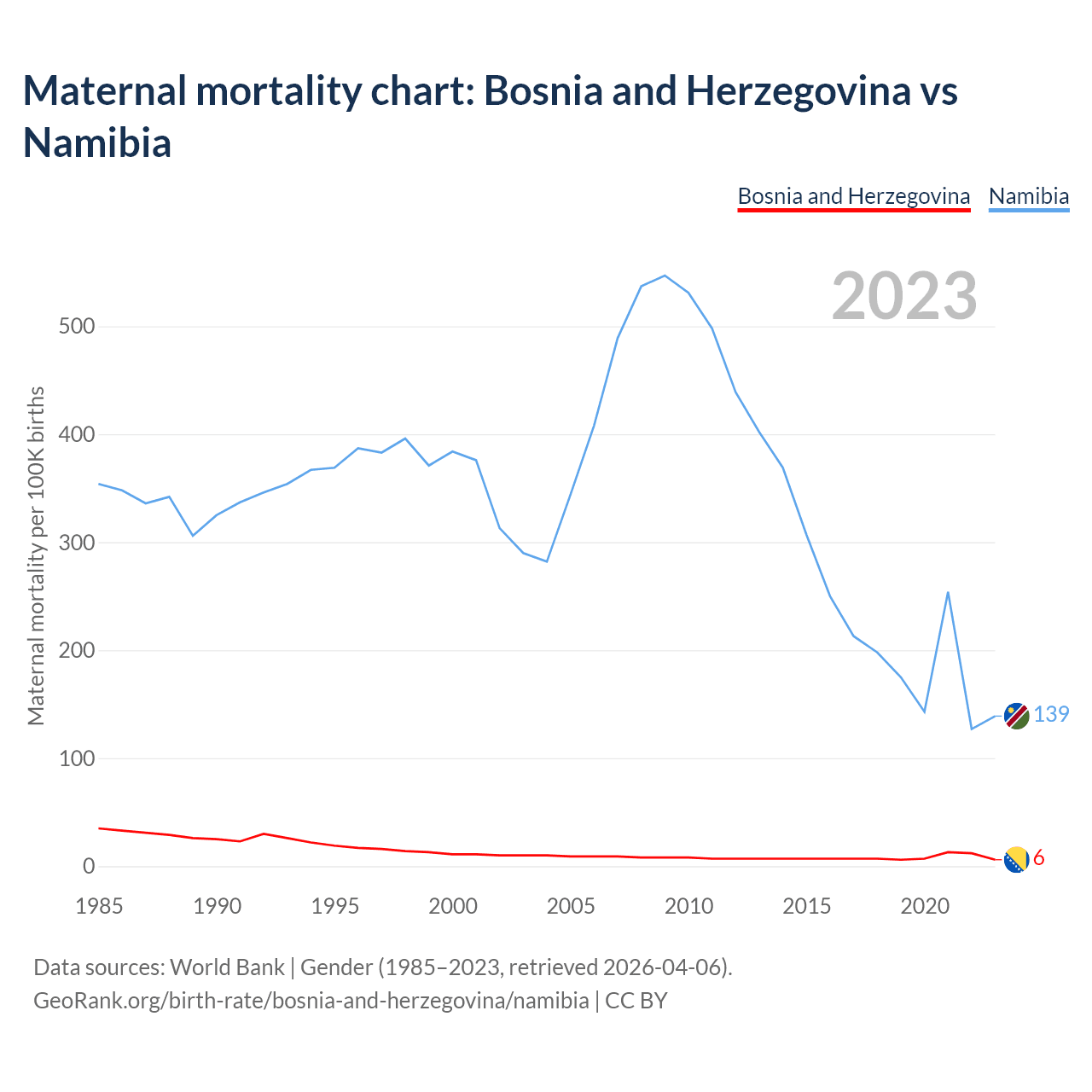 The maternal mortality rate, which is the probability of dying during childbirth or within 42 days of pregnancy termination, is 6 deaths per 100,000 live births in Bosnia and Herzegovina, compared to 139 deaths in Namibia.