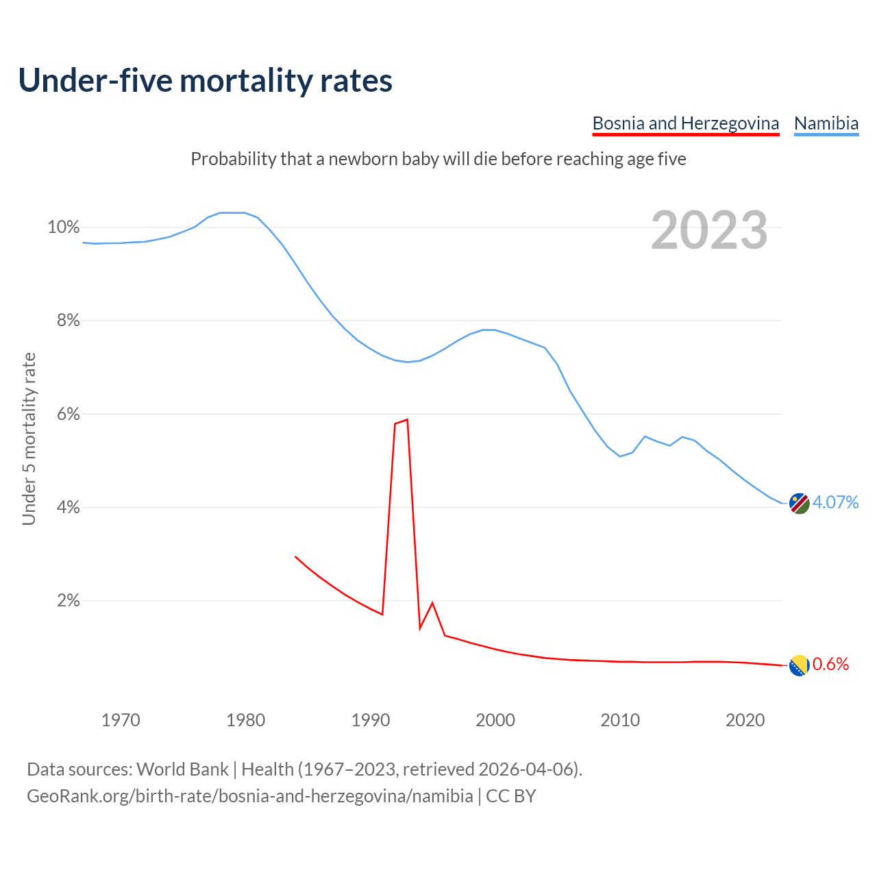 The chance that a newborn baby will die before reaching age five is 0.6% in Bosnia and Herzegovina and 4.07% in Namibia. Above is a chart with historical data on under-five mortality rates.
