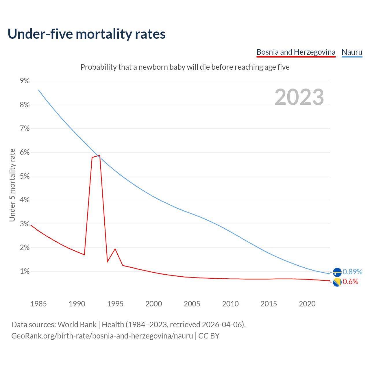 The chance that a newborn baby will die before reaching age five is 0.6% in Bosnia and Herzegovina and 0.89% in Nauru. Above is a chart with historical data on under-five mortality rates.